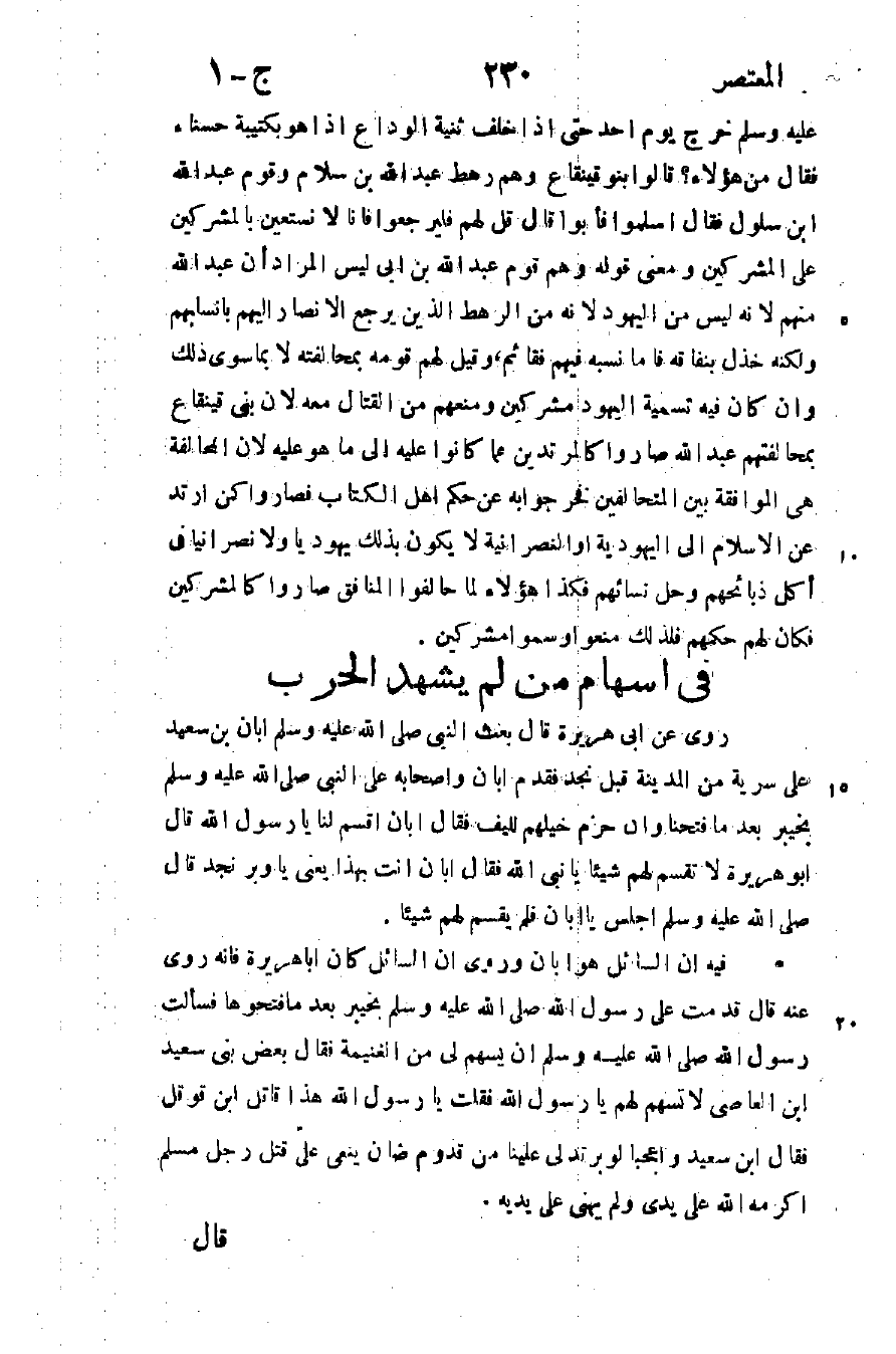 فيه أن السائل هو أبان وروى أن السائل كان أبا هريرة فإنه روى عنه قال قدمت على رسول الله صلى الله عليه وسلم بخيبر بعد ما فتحوها فسألت رسول الله صلى الله عليه وسلم أن يسهم لي من الغنيمة فقال بعض بني سعيد ابن العاصي: لا تسهم لهم يا رسول الله فقلت: يا رسول الله هذا قاتل ابن قوقل فقال ابن سعيد: واعجبا لوبر تدلى علينا من قدوم ضان ينعى علي قتل رجل مسلم أكرمه الله على يدي ولم يهنى على يديه.
