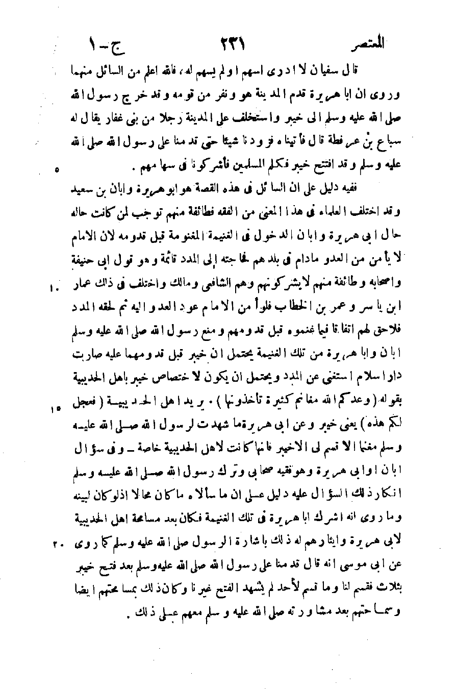 ففيه دليل على أن السائل في هذه القصة هو أبو هريرة وأبان بن سعيد وقد اختلف العلماء في هذا المعنى من الفقه فطائفة منهم توجب لمن كانت حاله حال أبي هريرة وأبان الدخول في الغنيمة المغنومة قبل قدومه لأن الإمام لا يأمن من العدو ما دام في بلدهم فحاجته إلى المدد قائمة وهو قول أبي حنيفة وأصحابه وطائفة منهم لا يشركونهم وهم الشافعي ومالك واختلف في ذلك عمار ابن ياسر وعمر بن الخطاب فلو أمن الإمام عود العدو إليه ثم لحقه المدد فلاحق لهم اتفاقا فيما غنموه قبل قدومهم ومنع رسول الله صلى الله عليه سلم أبان وأبا هريرة من تلك الغنيمة يحتمل أن خيبر قبل قدومهما عليه صارت دار إسلام استغنى عن المدد ويحتمل أن يكون لاختصاص خيبر بأهل الحديبية بقوله: {وَعَدَكُمُ اللَّهُ مَغَانِمَ كَثِيرَةً تَأْخُذُونَهَا} يريد أهل الحديبية {فَعَجَّلَ لَكُمْ هَذِهِ} يعني خيبر وعن أبي هريرة ما شهدت لرسول الله صلى الله عليه وسلم مغنما إلا قسم لي الأخير فإنها كانت لأهل الحديبية خاصة وفي سؤال أبان أو أبي هريرة وهو فقيه صحابي وترك رسول الله صلى الله عليه وسلم إنكار ذلك السؤال عليه دليل على أن ما سألاه ما كان محالا إذ لو كان لبينه وما روى أنه أشرك أبا هريرة في تلك الغنيمة فكان بعد مسامحة أهل الحديبية لأبي هريرة وإيثارهم له ذلك بإشارة الرسول صلى اله عليه وسلم كما روى عن أبي موسى أنه قال قدمنا على رسول الله صلى الله عليه وسلم بعد فتح خيبر بثلاث فقسم لنا وما قسم لأحد لم يشهد الفتح غيرنا وكان ذلك بمسامحتهم أيضا وسماحتهم بعد مشاورته صلى الله عليه وسلم معهم على ذلك.