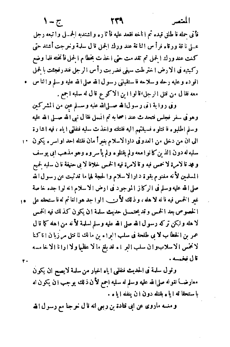 وفي رواية أتى رسول الله صلى الله عليه وسلم عين من المشركين وهو في سفر فجلس فتحدث عند أصحابه ثم انسل فقال نبي الله صلى الله عليه وسلم: "اطلبوه فاقتلوه" فسبقتهم إليه فقتلته وأخذت سلبه فنفلنيإياه فيه غشارة إلى أن من دخل من العدو في دار الإسلام بغير أمان فقتله أحد أو أسره يكون سلبه له دون الذين كانوا معه ولم يقتلوه ولم يأسروه وهو مذهب أبي يوسف ومحمد قالا مرة لا خمس فيه وقالا مرة فيه الخمس خلافا لأبي حنيفة فإن سلبه لجميع المسلمين لأنه مغنوم بقوة دار الإسلام والحجة لهما ما قد ثبت عن رسول الله صلى الله عليه وسلم في الركاز الموجود في أرض الأسلام أنه لواجده خاصة غير الخمس فيه فإنه لأهله وذلك لأن الواجد هو الغانم له فاستحقه على الخصوص بعد الخمس وقد يحتمل حديث سلمة أن يكون كذلك فيه الخمس لأهله ولكن تركه رسول اله صلى الله عليه وسلم لسلمة لانه من أهله كما قال عمر بن الخطاب لأبي طجلحة في سلب الرابء بم مالك لما قتل مرز بان إنا كنا لا نخمس الإسلاب وإن سلب البراء قد بلغ مالا عظيما ولا أرانا إلا خامسه قال: فخمسه.