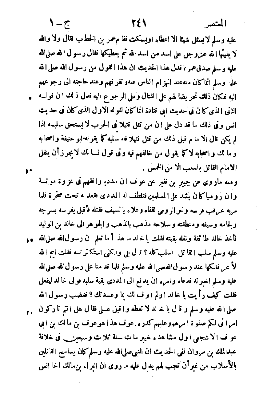 ومنه ما روى عن جبير بن نفير عن عوف أن مدديا وافقهم في غزوة موته وإن روميا كان يشد على المسلمين فتلطف له المددى فقعد له تحت صخرة فلما مربه عرقب فرس وخر الرومي لقفاه وعلاه بالسيف فقتله فأقبل بفرسه بسرجه ولجامه وسيفه ومنطقته وسلاحه مذهب بالذهب والجوهر إلى خالد بن الوليد فأخذ خالد طائفة ونفله بقيته فقلت: يا خالد ما هذا أما تعلم أن رسول الله صلى الله عليه وسلم سلب القاتل السلب كله؟ قال: بلى ولكني استكثرته فقلت: إيم الله لأعرفنكها عند رسول الله صلى الله عليه وسلم فلما قدمنا على رسول الله صلى الله عليه وسلم أخبرته خبره فدعاه وأمره أن يدفع إلى المددى بقية سلبه فولى خالد ليفعل فقلت: كيف رأيت يا خالد أو لم أوف لك بما وعدتك فغضب رسول الله صلى الله عليه وسلم وقال يا خالد لا تعطه واقبل على فقال: "هل أنتم تاركون امرائي لكم صفوة أمرهم وعليهم كدره" عوف هذا هو عوف بن مالك بن أبي عوف الأجشعي أول مشاهده خيبر مات سنة ثلاث وسبعين في خلافة عبد الملك بن مروان ففي الحديث أن النبي صلى الله عليه وسلم كان يسامح القاتلين بالأسلاب من غير أن تجب لهم يدل عليه ما روى أن البراء بن مالك أخا أنس