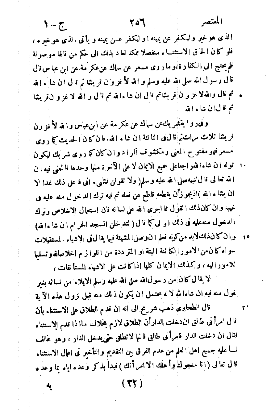 وفي رواية شريك عن سماك عن عكرمة عن ابن عباس "والله لأغزون قريشا" ثلاث مرات ثم قال: في الثالثة "إن شاء الله" فإن كان الحديث كما روى مسعر فهو مفتوح المعنى ومكشوف المراد وإن كان كما روى شريك فيكون قوله: "إن شاء الله" راجعا على جميع الإيمان لا على الآخرة منها وحدها فالمعنى فيه إن الله تعالى قال لنبيه صلى الله عليه وسلم: {وَلا تَقُولَنَّ لِشَيْءٍ إِنِّي فَاعِلٌ ذَلِكَ غَداً ِلَّا أَنْ يَشَاءَ اللَّهُ} إذ يجوز أن يقطعه قاطع عن فعله ثم فيه ترك الدخول منه عليه في غيبه وإن كان ذلك القول مما أجرى الله على لسانه فإن استعمال الإخلاص وترك الدخول منه عليه في ذلك أولى كما قال: {لَتَدْخُلُنَّ الْمَسْجِدَ الْحَرَامَ إِنْ شَاءَ اللَّهُ} وإن كان ذلك لابد من كونه فعلم أن وصل الشيئة فيما يقال في الأشياء المستقيلات سواء كان من الأمور الكائنة البتة أو المترددة من اللوازم إخلاصا لله وتسليما للأمور إليه وكذلك الإيمان كلها إذا كانت على الأشياء المستأنفات.