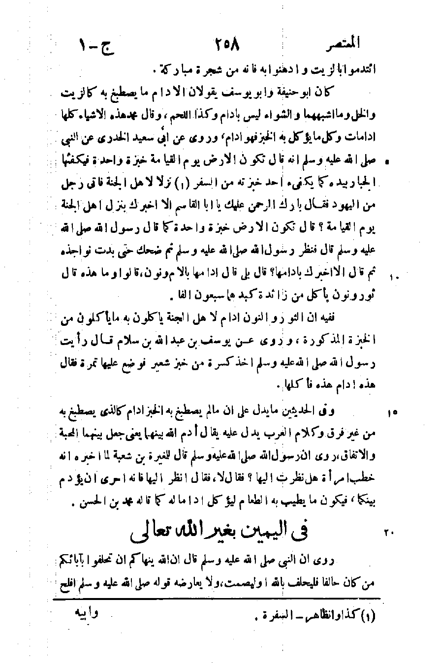 كان أبو حنيفة وأبو يوسف يقولان الادام ما يصطبغ به كالزيت والخل وما أشبههما والشواء ليس بادام وكذا اللحم وقال محمد هذه الأشياء كلها ادامات وكل ما يؤكل به الخبز فهو ادام وروى عن أبي سعيد الخدري عن النبي صلى الله عليه وسلم أنه قال: "تكون الأرض يوم القيامة خبزة واحدة فيكفئها الجبار بيده كما يكفئ أحد خبزته من السفر 1 نزلا لأهل الجنة" فأتى رجل من اليهود فقال: بارك الرحمن عليك يا أبا القاسم ألا أخبرك بنزل أهل الجنة يوم القيامة؟ قال: تكون الأرض خبزة واحد كما قال رسول الله صلى الله عليه وسلم قال: فنظر رسول الله صلى الله عليه وسلم ثم ضحك حتى بدت نواجذه ثم قال: ألا أخبرك بإدامها؟ قال: بلى, قال: "إدامها بالأم ونون" قالوا: وما هذه, قال: "ثور ونون يأكل من زائدة كبدهما سبعون ألفا".