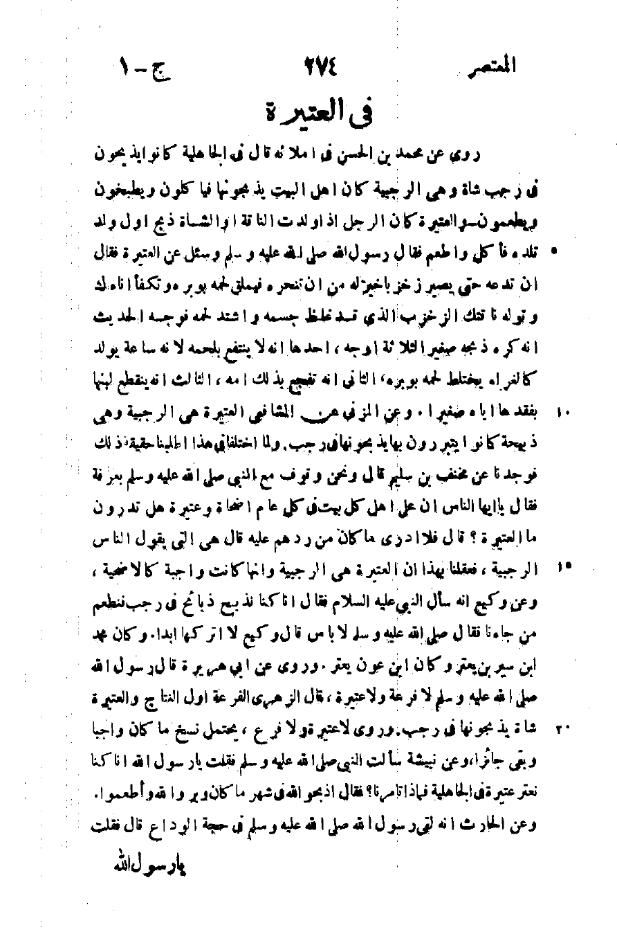 روي عن محمد بن الحسن في إملائه قال في الجاهلية كانوا يذبحون في رجب شاة وهي الرجية كان أهل البيت يذبحونها فيأكلون ويطبخون ويطعمون والعتيرة كان الرجل إذا ولدت الناقة والشاة ذبح أول ولد تلده فأكل وأطعم فقال رسول الله صلى الله عليه وسلم وسئل عن التعيرة فقال: "إن تدعه حتى يصير زخزبا خير له من أن تنحره فيملق لحمه بوبره وتكفأ إناءك وتوله ناقتك" الزخزب الذي قد غلظ جسمه واشتد لحمه فوجه الحديث أنه كره ذبحه صغير الثلاثة أوجه أحدها أنه لا ينتفع بلحمه لأنه ساعة يولد كالغراء يختلط لحمه بوبره الثاني أنه تفجع بذلك أمه الثالث أنه ينقطع لبنها بفقدها إياه صغيرا وعن المزنى عن المشافعي العتيرة هي الرجبية وهي ذبيحة كانوا يتبررون بها يذبحونها في رجب ولما اختلفا في هذا أطلبنا حقيقة ذلك فوجدنا عن مخنف بن سليم قال ونحن وقوف مع النبي صلى الله عليه وسلم بعرفة فقال: "يا أيها الناس إن على أهل كل بيت في كل عام أضحاة وعتيرة هل تدرون مال اعتيرة؟ " قال: فلا أدري ما كان من ردهم عليه قال: "هي التي يقول الناس الرجبية" فعقلنا بهذا أن العتيرة هي الرجبية وأنها كانت واجبة كالأضحية وعن وكيع أنه سأل النبي عليه السلام فقال: إنا كنا نذبح ذبائح في رجب فنكعم من جاءنا فقال صلى الله عليه وسلم: "لا بأس" قال وكيع: لا أتركاها أبدا وكان محمد ابن سيرين يعتر وكان ابن عون يعتر وروى عن أبي هريرة قال رسول الله صلى الله عليه وسلم: "لا فرعة ولا عتيرة" قال الزهري الفرعة ول النتاج والعتيرة شاة يذبحونها في رجب وروى لا عتيرة ولا فرع يحتمل نسخ ما كان واجبا وبقي جائزا وعن نبيشة سألت النبي صلى الله عليه وسلم فقلت: يا رسول الله إنا كنا نعتر عتيرة في الجاهلية فماذا تأمرنا فقال: "اذبحوا لله في شهر ما كان وبروا لله وأطعموا" وعن الحارث أنه لقي رسول الله صلى الله عليه وسلم في حجة الوداع قال: فقلت: