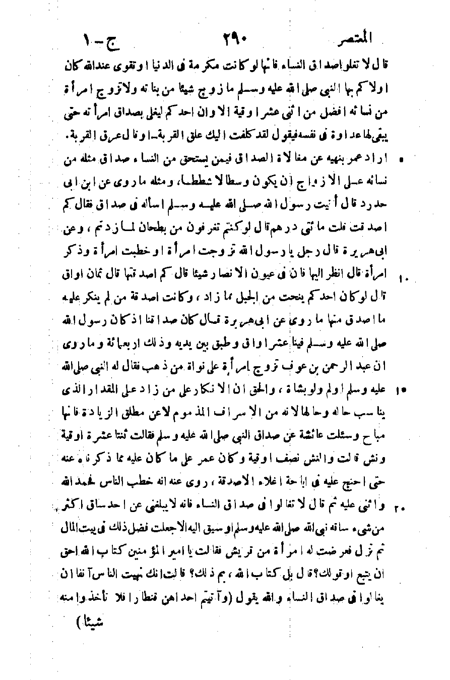 قال: "لا تغلوا صداق النساء فإنها لو كانت مكرمة في الدنيا أو تقوى عند الله كان أولاكم بها النبي صلى الله عليه وسلم ما زوج شيئا من بناته ولا تزوج امرأة من نسائه أفضل من اثنى عشر أوقية إلا وإن أحدكم ليغلى بصداق امرأته حتى يبقى لها عداوة في نفسه فيقول: لقد كلفت إليك علق القربة" أو قال عرق القربة أراد عمر بنهيه عن مغالاة الصداق فيمن يستحق من النساء صداق مثله من نسائه على الأزواج أن يكون وسطا لا شططا ومثله ما روي عن ابن أبي حد رد قال أتيت رسول الله صلى الله عليه وسلم أسأله في صداق فقال: "كم أصدقت" فلت مائتي درهم قال: "لو كنتم تغرفون من بطحان لمازدتم" وعن أبي هريرة قال رجل يا رسول الله تزوجت امرأة أو خطبت امرأة وذلك امرأة قال: "انظر إليها فإن في عيون الأنصار شيئا" قال: "كم أصدقتها" قال ثمان أواق قال: "لو كان أحدكم ينحت من الجبل ما زاد" وكانت أصدقة من لم ينكر عليه ما أصدق منها ما روى عن أبي هريرة قال كان صداقنا إذ كان رسول الله صلى الله عليه وسلم فينا عشر أواق وطبق بين يديه وذلك أربعمائة وما روى أن عبد الرحمن بن عوف تزوج امرأة على نواة من ذهب فقال له النبي صلى الله عليه وسلم: "أو لم ولو بشاة" والحق إن الإنكار على من زاد على المقدار الذي يناسب حاله وحالها لأنه من الإسراف المذموم لا عن مطلق الزيادة فإنها مباح وسئلت عائشة عن صداق النبي صلى الله عيه وسلم فقالت: ثنتا عشرة أوقية ونش قالت: والنش نصف أوقية وكان عمر على ما كان عليه مما ذكرناه عنه حتى احتج عليه في إباحة إغلاء إلا صدقة روي عنه أنه خطب الناس فحمد الله واثنى عليه ثم قال: لا تغالوا في صداق النساء فإنه لا يبلغني عن أحد ساق أكثر من شيء ساقه نبي الله صلى اله عيه وسلم أو سيق إليه إلا جعل فضل ذلك في بيت المال ثم نزل فعرضت له امرأة من قريش فقالت: يا أمير المؤمنين كتاب الله أحق أن يتبع أو قولك قال: بل كتاب الله بم ذلك قالت: أنك نهيت الناس آنفا أن يغالوا في صداق النساء والله يقول: {وَآتَيْتُمْ إِحْدَاهُنَّ قِنْطَاراً فَلا تَأْخُذُوا مِنْهُ