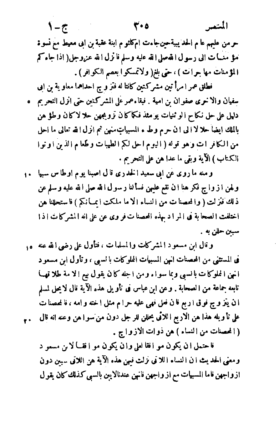 ومنه ما روي عن أبي سعيد الخدري قال أصبنا يوم أوطاس سبيا ولهن أزواج فكرهنا أن نقع عليهن فسألنا رسول الله صلى الله عليه وسلم عن ذلك فنزلت: {وَالْمُحْصَنَاتُ مِنَ النِّسَاءِ إِلَّا مَا مَلَكَتْ أَيْمَانُكُمْ} فاستحللناهن اختلفت الصحابة في المراد بهذه المحصنات فروى عن علي أنه المشركات إذا سبين حللن به.