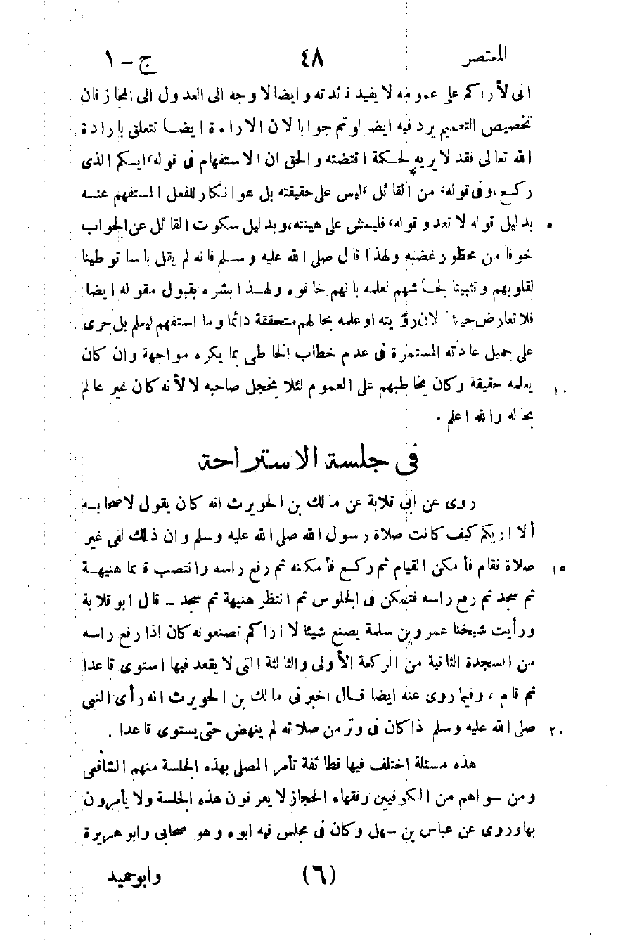 روى عن أبي قلابة عن مالك بن الحويرث أنه كان يقول لأصحابه ألا أريكم كيف كانت صلاة رسول الله صلى الله عليه وسلم وإن ذلك لفي غير صلاة فقام فأمكن القيام ثم ركع فأمكنه ثم رفع رأسه وانتصب قائما هنيهة ثم سجد ثم رفع رأسه فتمكن في الجلوس ثم انتظر هنيهة ثم سجد قال أبو قلابة ورأيت شيخنا عمرو بن سلمة يصنع شيئا لا أراكم تصنعونه كان إذا رفع رأسه من السجدة الثانية من الركعة الأولى والثالثة التي لا يقعد فيها استوى قاعدا ثم قام وفيما روى عنه أيضا قال أخبرني مالك بن الحويرث أنه رأى النبي صلى الله عليه وسلم إذا كان في وتر من صلاته لم ينهض حتى يستوي قاعدا. هذه مسألة اختلف فيها فطائفة تأمر المصلي بهذه الجلسة منهم الشافعي ومن سواهم من الكوفيين وفقهاء الحجاز لا يعرفون هذه الجلسة ولا يأمرون بها وروى عن عباس بن سهل وكان في مجلس فيه أبوه وهو صحابي وأبو هرير