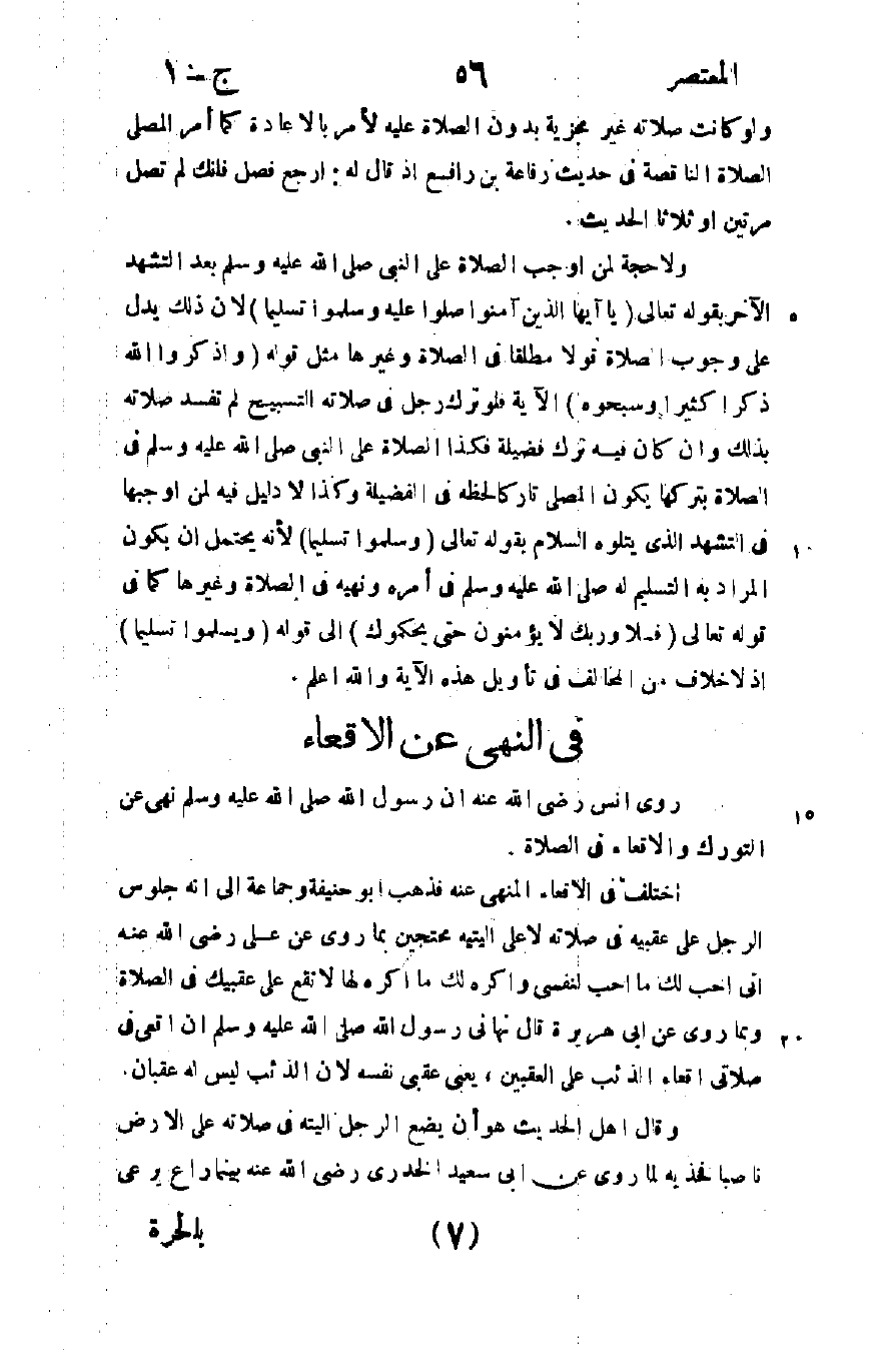 روى أنس رضي الله عنه أن رسول الله صلى الله عليه وسلم نهى عن التورك والاقعاء في الصلاة اختلف في الاقعاء المنهي عنه فذهب أبو حنيفة وجماعة إلى أنه جلوس الرجل على عقبيه في صلاته لا على إليتيه محتجين بما روى عن علي رضي الله عنه إني أحب لك ما أحب لنفسي وأكره لك ما أكره لها لا تقع على عقبيك في الصلاة وبما روى عن أبي هريرة قال نهاني رسول الله صلى الله عليه وسلم أن اقعي في صلاتي اقعاء الذئب على العقبين يعني عقبي نفسه لأن الذئب ليس له عقبان وقال أهل الحديث هو أن يضع الرجل اليته في صلاته على الأرض ناصبا فخذيه لما روى عن أبي سعيد الخدري رضي الله عنه بينما راع يرعي