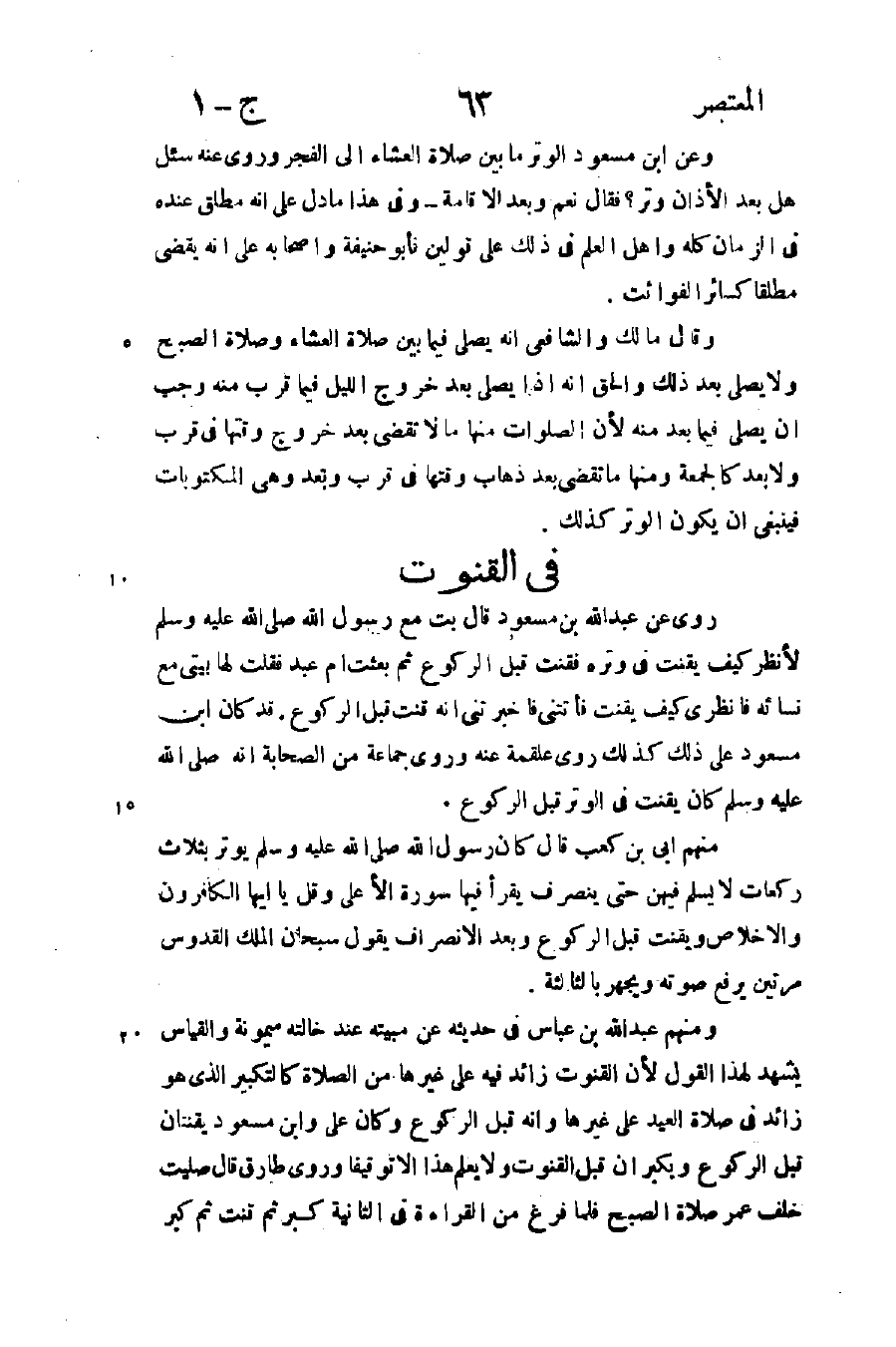 روى عن عبد الله بن مسعود قال: بت مع رسول الله صلى الله عليه وسلم لأنظر كيف يقنت في وتره فقنت قبل الركوع ثم بعثت أم عبد فقلت لها بيتي مع نسائه فانظري كيف يقنت فأتتني فأخبرتني أنه يقنت قبل الركوع قد كان ابن مسعود على ذلك روى علقمة عنه وروى جماعة من الصحابة أنه صلى الله عليه وسلم كان يقنت في الوتر قبل الركوع.