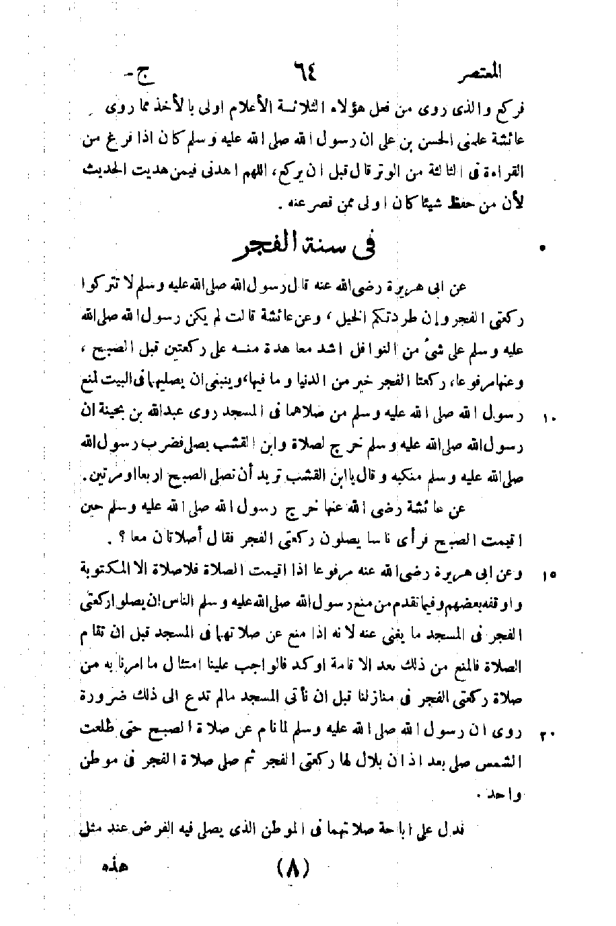 عن أبي هريرة رضي الله عنه قال رسول الله صلى الله عليه وسلم: "لا تتركوا ركعتي الفجر وإن طردتكم الخيل" وعن عائشة قالت: لم يكن رسول الله صلى الله عليه وسلم على شيء من النوافل أشد معاهدة منه على ركعتي الصبح وعنهما مرفوعا: "ركعتا الفجر خير من الدنيا وما فيها" وينبغي أن يصليهما في البيت لمنع رسول الله صلى الله عليه وسلم من صلاهما في المسجد روى عبد الله بن بحينة أن رسول الله صلى الله عليه وسلم خرج لصلاة وابن القشب يصلي فضرب رسول الله صلى الله عليه وسلم منكبه وقال: "يا ابن القشب تريد أن تصلي الصبح أربعا أو مرتين؟ " عن عائشة رضي الله عنها: خرج رسول الله صلى الله عليه وسلم حين أقيمت الصبح فرأى ناسا يصلون ركعتي الفجر فقال: "أصلاتان معا؟ ".