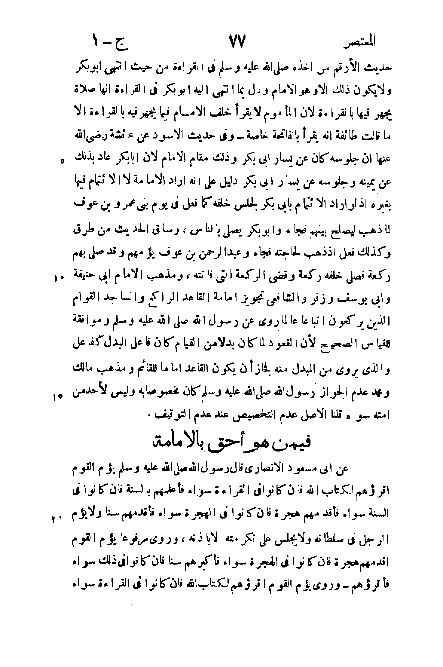 عن أبي مسعود الأنصاري قال رسول الله صلى الله عليه وسلم: "يؤم القوم اقرؤهم لكتاب الله فإن كانوا في القراءة سواء فأعلمهم بالسنة فإن كانوا في السنة سواء فأقدمهم هجرة فإن كانوا في الهجرة سواء فأكبرهم سنا ولا يؤم الرجل في سلطانه ولا يجلس على تكرمته إلا بإذنه" وروى مرفوعا: "يؤم القوم أقدمهم هجرة فإن كانوا في الهجرة سواء فأكبرهم سنا فإن كانوا في ذلك سواء فأقرؤهم وروى يؤم القوم أقرؤهم لكتاب الله فإن كانوا في القراءة سواء