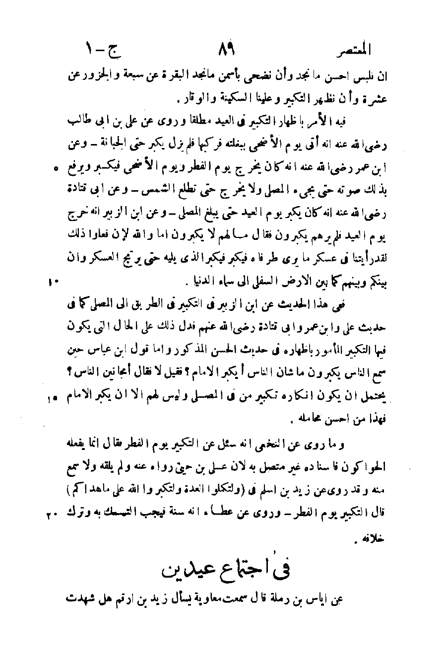 أن نلبس أحسن ما نجد وأن نضحي بأسمن ما نجد البقرة عن سبعة والجزور عن عشرة وأن نظهر التكبير وعلينا السكينة والوقار. فيه الأمر بإظهار التكبير في العيد مطلقا وروى عن علي بن أبي طالب رضي الله عنه أنه أتى يوم الأضحى ببغلته فركبها فلم يزل يكبر حتى الجبانة وعن ابن عمر رضي الله عنه أنه كان يخرج يوم الفطر ويوم الأضحى فيكبر ويرفع بذلك صوته حتى يجيء المصلى ولا يخرج حتى تطلع الشمس وعن أبي قتادة رضي الله عنه أنه كان يكبر يوم العيد حتى يبلغ المصلى وعن ابن الزبير أنه خرج يوم العيد فلم يرهم يكبرون فقال ما لهم لا يكبرون أما والله لإن فعلوا ذلك لقد رايتنا في عسكر ما يرى طرفاه فيكبر فيكبر الذي يليه حتى يرتج العسكر وإن بينكم وبينهم كما بين الأرض السفلى إلى سماء الدنيا.