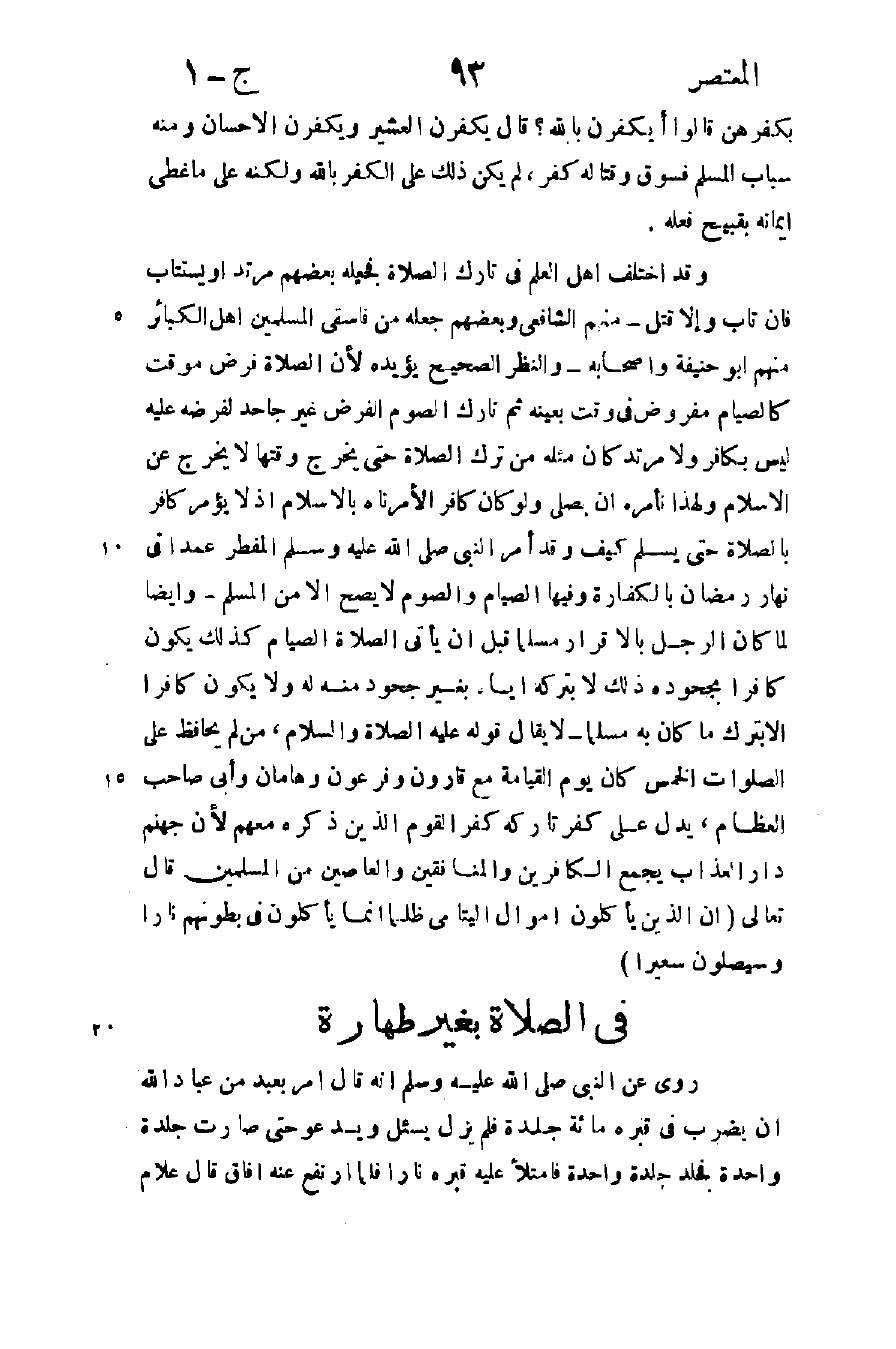 "بكفرهن" قالوا: أيكفرن بالله؟ قال: "يكفرن العشير ويكفرن الإحسان" ومنه "سباب المسلم فسوق وقتاله كفر" لم يكن ذلك على الكفر بالله ولكنه على ما غطى إيمانه بقبيح فعله وقد اختلف أهل العلم في تارك الصلاة فجعله بعضهم مرتد أو يستتاب فإن تاب وإلا قتل منهم الشافعي وبعضهم جعله من فاسقي المسلمين أهل الكبائر منهم أبو حنيفة وأصحابه والنظر الصحيح يؤيده لأن الصلاة فرض موقت كالصيام مفروض في وقت بعينه ثم تارك الصوم الفرض غير جاحد لفرضه عليه ليس بكافر ولا مرتد كان مثله مثل ترك الصلاة حتى يخرج وقتها لا يخرج عن الإسلام ولهذا نأمره أن يصلي ولو كان كافرا لأمرناه بالإسلام إذ لا يؤمر كافر بالصلاة حتى يسلم كيف وقد أمر النبي صلى الله عليه وسلم المفطر عمدا في نهار رمضان بالكفارة وفيها الصيام والصوم لا يصح إلا من المسلم وأيضا لما كان الرجل بالإقرار مسلما قبل أن يأتي الصلاة الصيام كذلك يكون كافر بجحوده ذلك لا بتركه إياه بغير جحود منه له ولا يكون كافرا إلا بترك ما كان به مسلما لا يقال قوله عليه الصلاة والسلام: "من لم يحافظ على الصلوات الخمس كان يوم القيامة مع قارون وفرعون وهامان وأبي صاحب العظام" يدل على كفر تاركه كفر القوم الذين ذكره معهم لأن جهنم دار العذاب يجمع الكافرين والمنافقين والعاصين من المسلمين قال تعالى: {إِنَّ الَّذِينَ يَأْكُلُونَ أَمْوَالَ الْيَتَامَى ظُلْماً إِنَّمَا يَأْكُلُونَ فِي بُطُونِهِمْ نَاراً وَسَيَصْلَوْنَ سَعِيراً} .