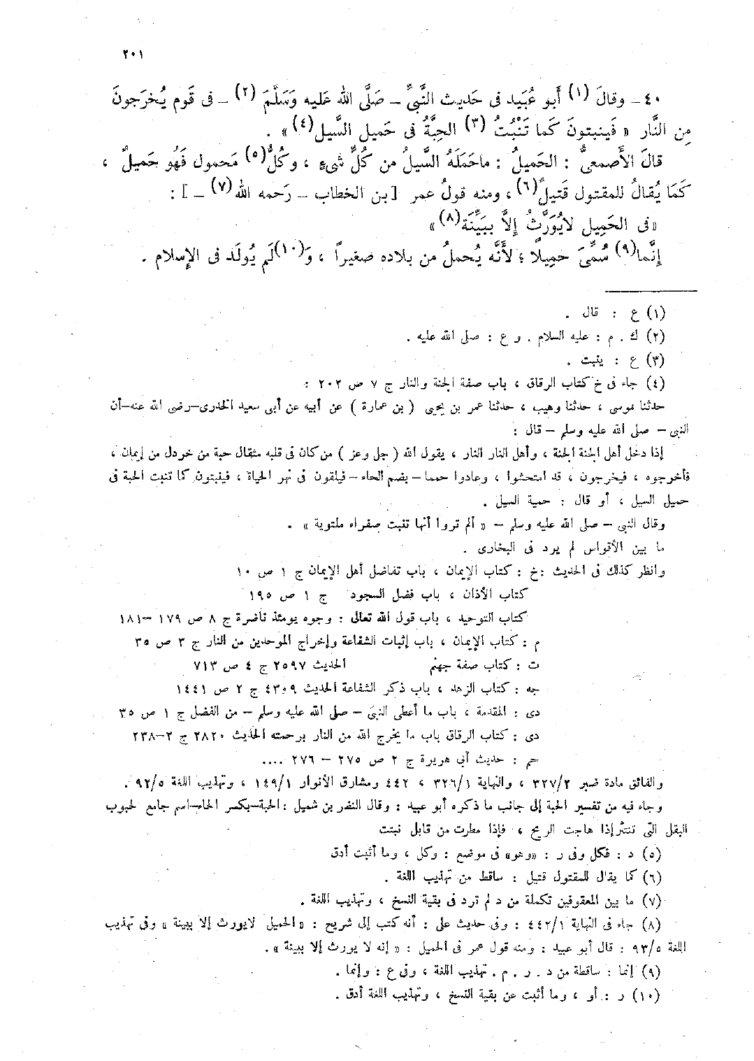 40 - وقال أبو عبيد فى حديث النَّبىِّ -صلَّى الله عليه وسلَّم- فى قوم يخرجون من النَّار "فينبتون كما تنبت الحبَّة فى حميل السَّيل".