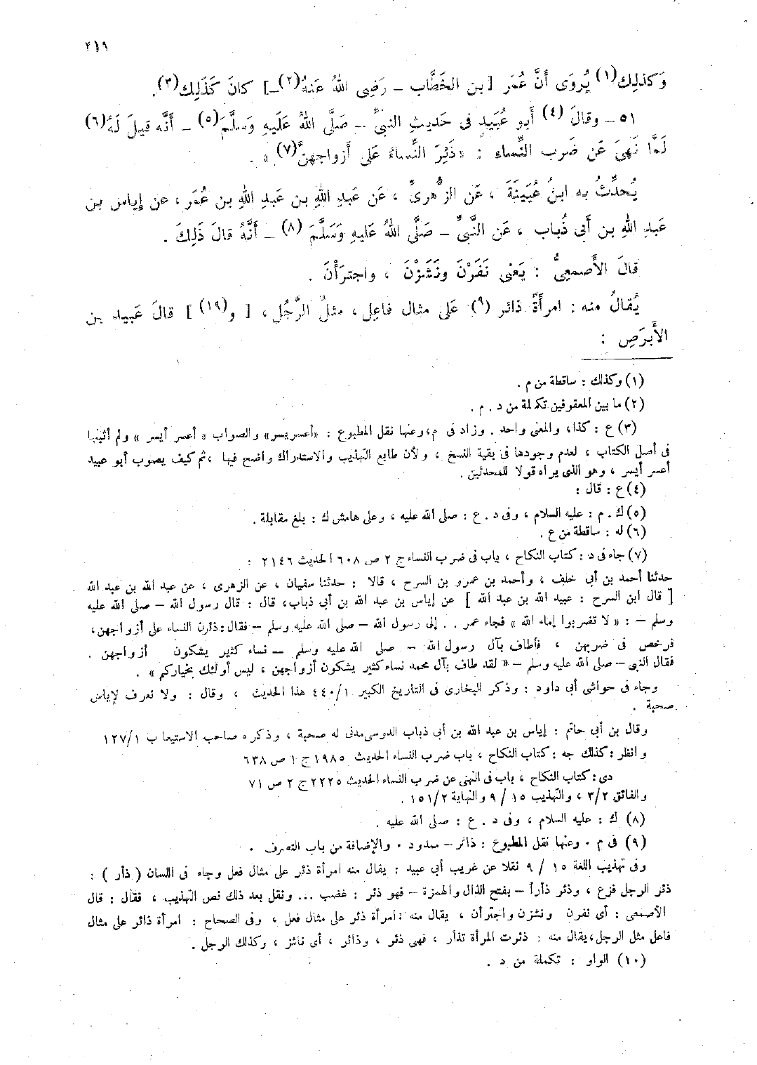51 - وقال أبو عبيد في حديث النبيّ -صلى الله عليه وسلم- أنه قيل له لمّا نهى عن ضرب النسلء: "ذئر النساء على أزواجهن".