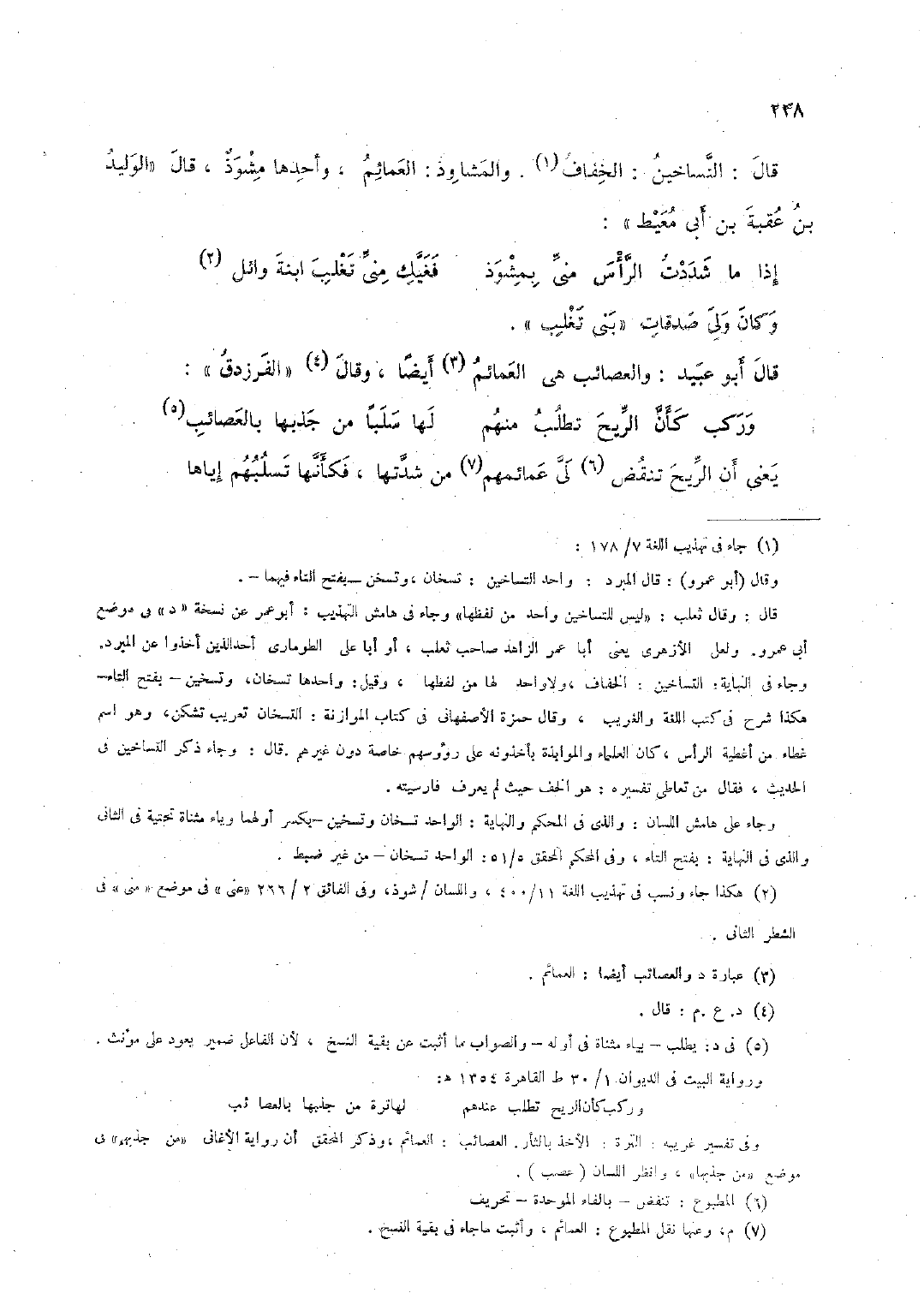 قال: التساخين: الخفاف. والمشاود: العمائم، وأحدها مشوذ، قال "الوليد بن عقبة بن أبي معيط":