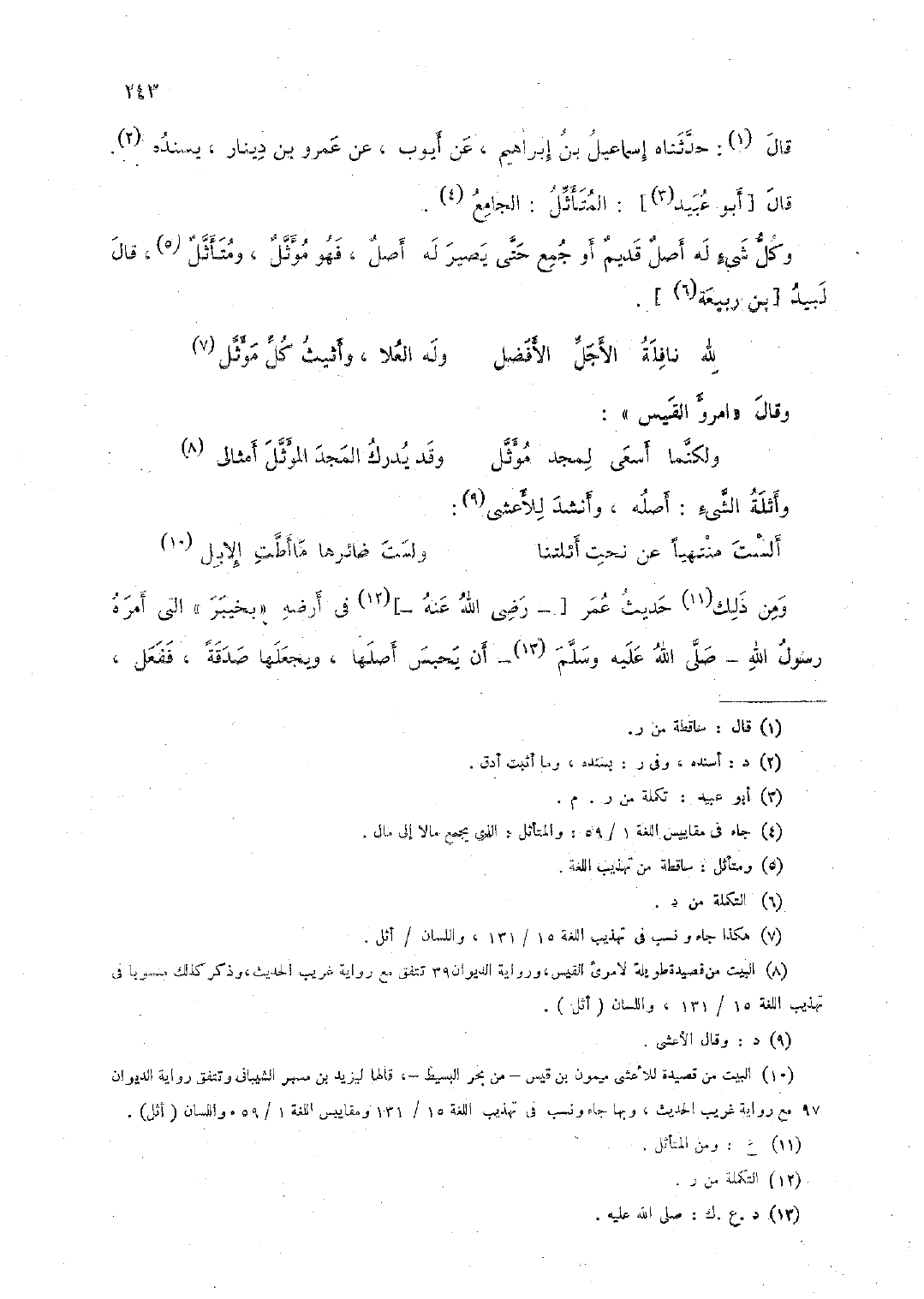 قال: حدثناه إسماعيل بن إبراهيم، عن أيوب، عن عمرو بن دينار، يسنده قال [أبو عبيد]: المتأثل: الجامع.