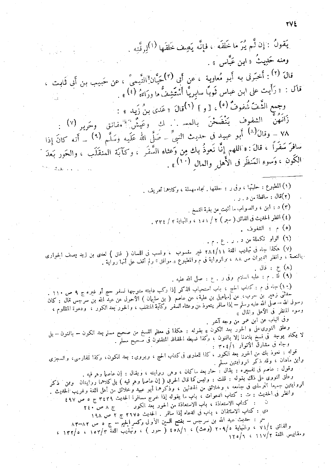 78 - وقال أبو عبيد في حديث النبيّ -صلى الله عليه وسلم- أنه كان إذا سافر سفرًا، قال: "اللهم إنا نعوذ بك من وعثاء السفر، وكآبة المنقلب، والحور بعد الكون، وسوء المنظر في الأهل والمال".