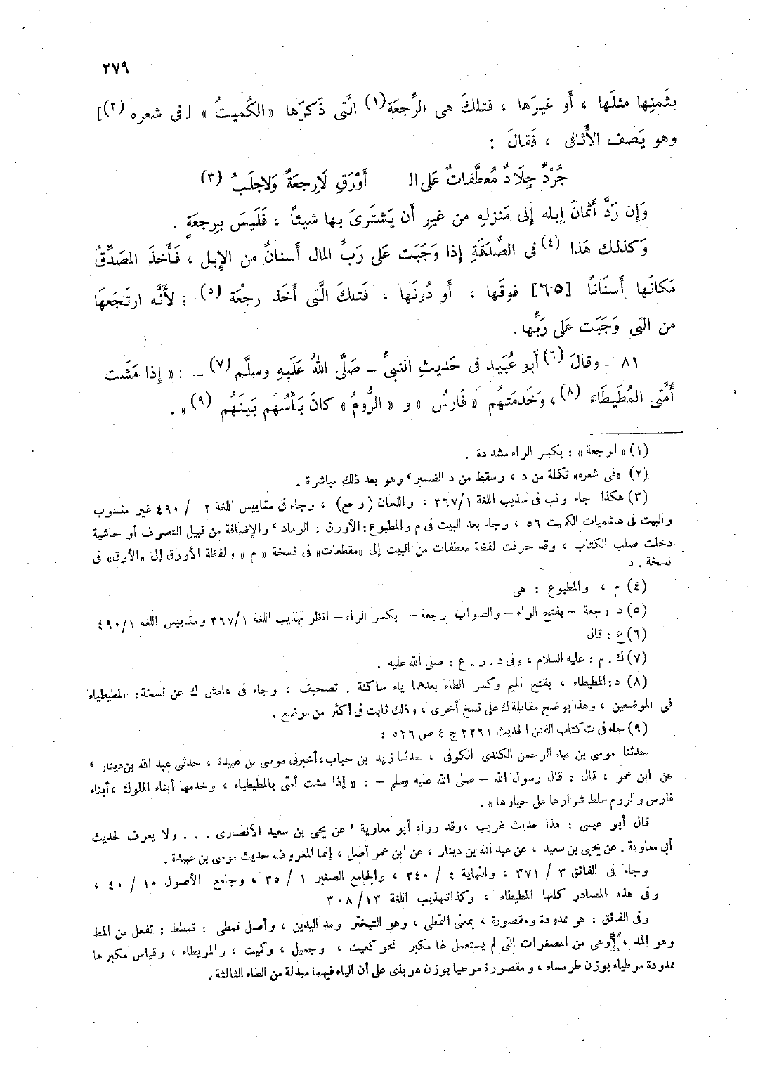 وكذلك هذا في الصدقة إذا وجبت على رب المال أسنان من الإبل، فأخذ المصدّق مكانها أسنانًا [65] فوقها، أو دونها، فتلك التي أخذ رجعة؛ لأنه ارتجعها من التي وجبت على ربّها.