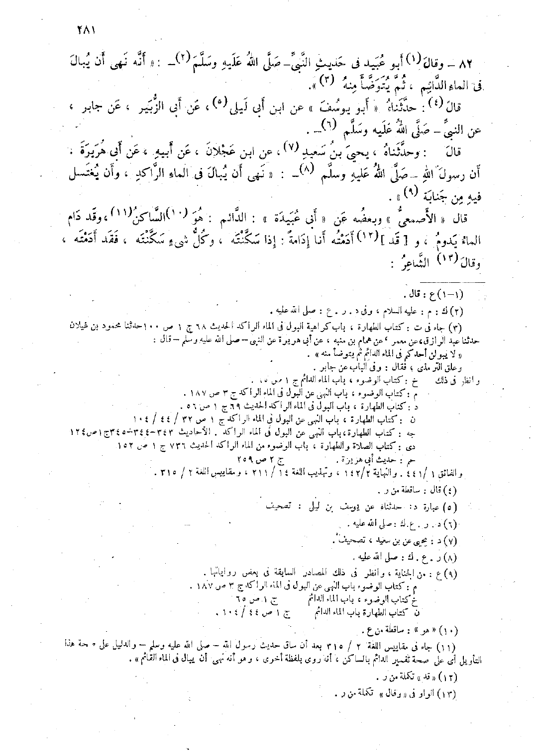 82 - وقال أبو عبيد في حديث النبيّ -صلى الله عليه وسلم-: "أنه نهى أن يبال في الماء الدائم، ثم يتوضّأ منه".