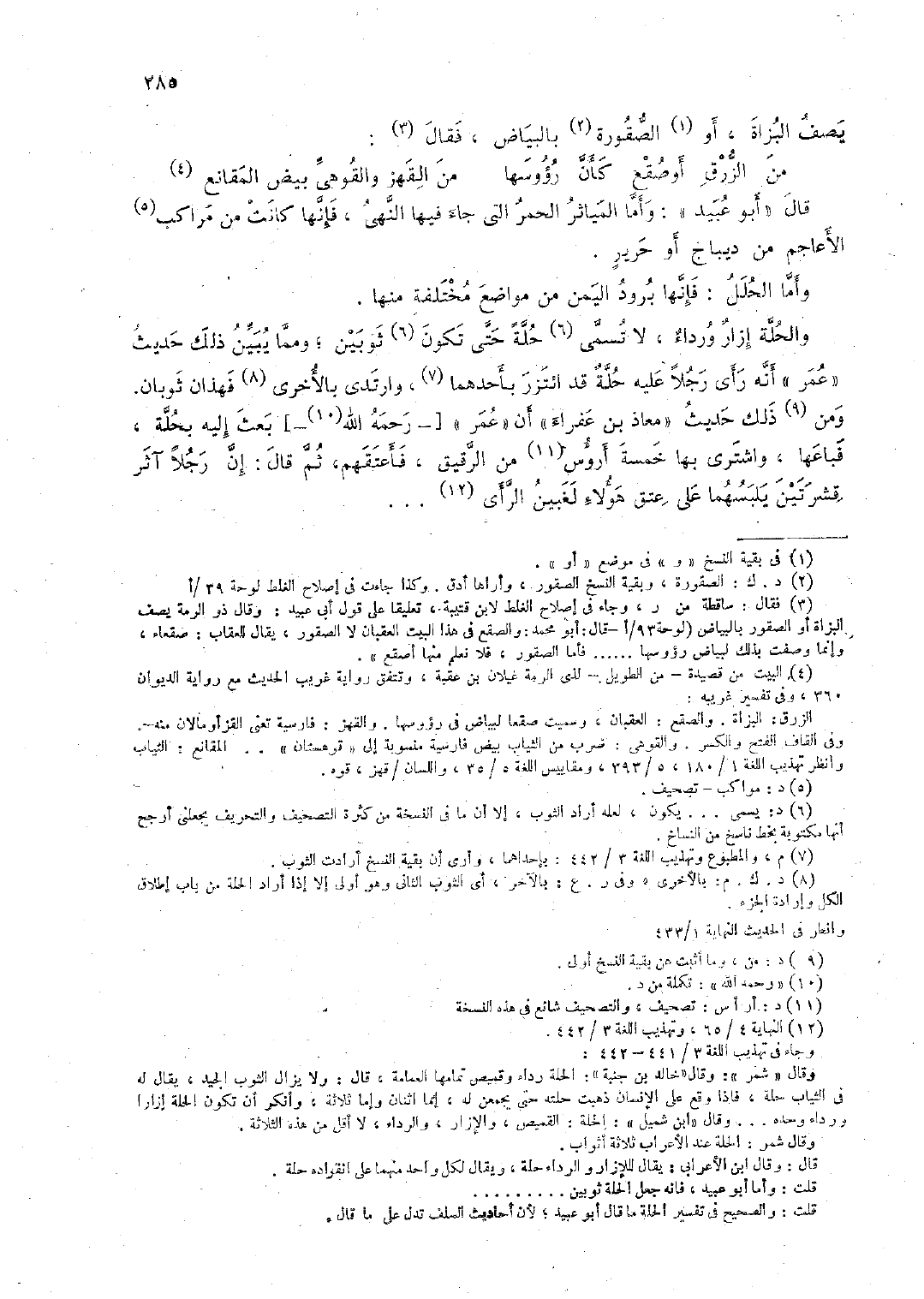والحلة إزار ورداء، لا تسمى حلة حتى تكون ثوبين؛ ومما يبين ذلك حديث "عمر" أنه رأى رجلا عليه حلة قد ائتزر بأحدهما، وارتدى بالأخرى فهذان ثوبان. ومن ذلك حديث "معاذ بن عفراء" أن "عمر" [-رحمه الله-] بعث إليه بحلة، فباعها، واشترى بها خمسة أرؤس من الرقيق، فأعتقهم، ثم قال: إن رجلاً آثر قشرتين يلبسها على عتق هؤلاء لغبين الرأي ...