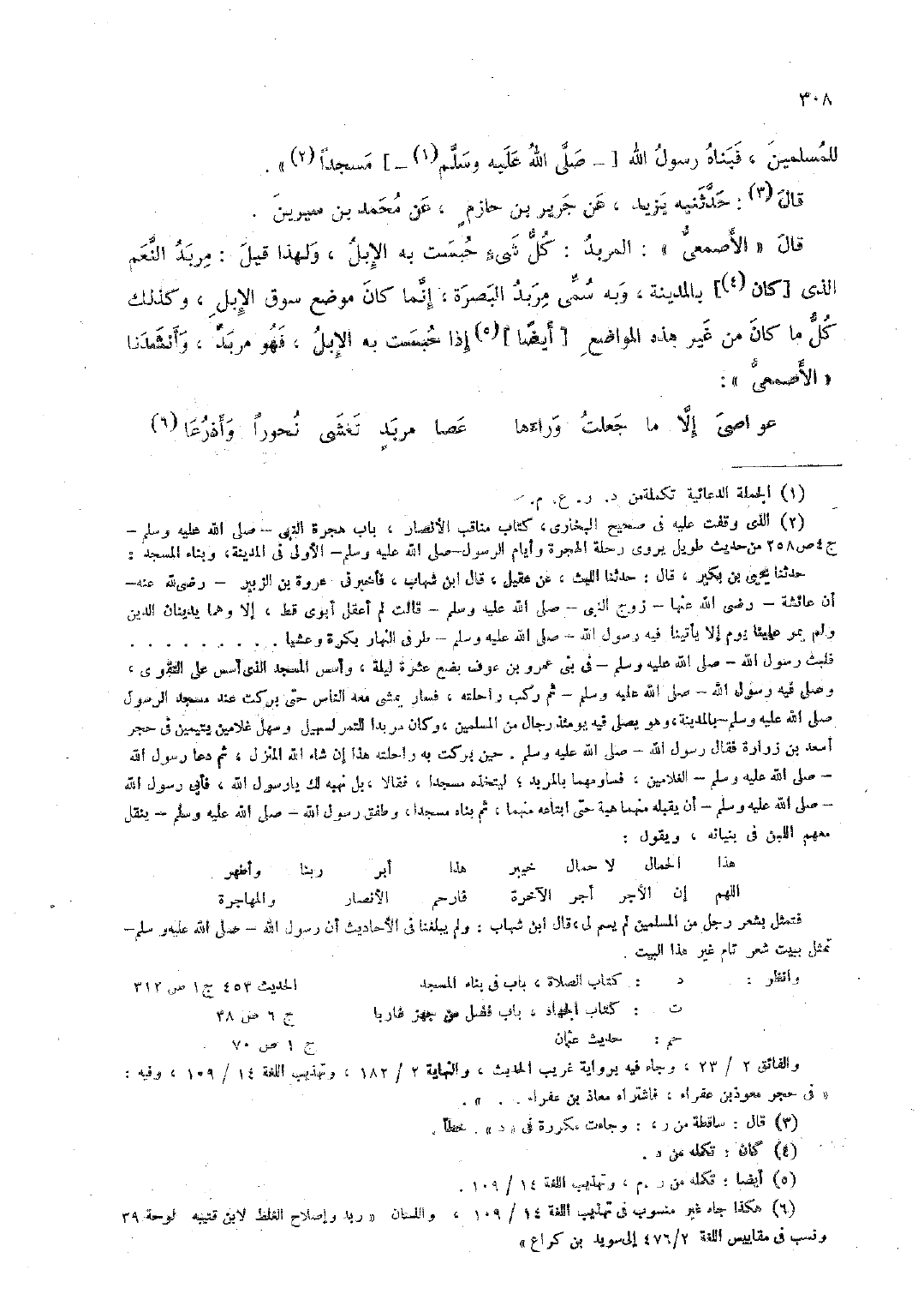 قال "الأصمعي": المربد: كل شيء حبست به الإبل، ولهذا قيل: مربد النعم الذي [كان] بالمدينة، وبه سمي مربد البصرية، إنما كان موضع سوق الإبل، وكذلك كل ما كان من غير هذه المواضع [أيضًا] إذا حبست به الإبل، فهو مربد، وأنشدنا "الأصمعي":