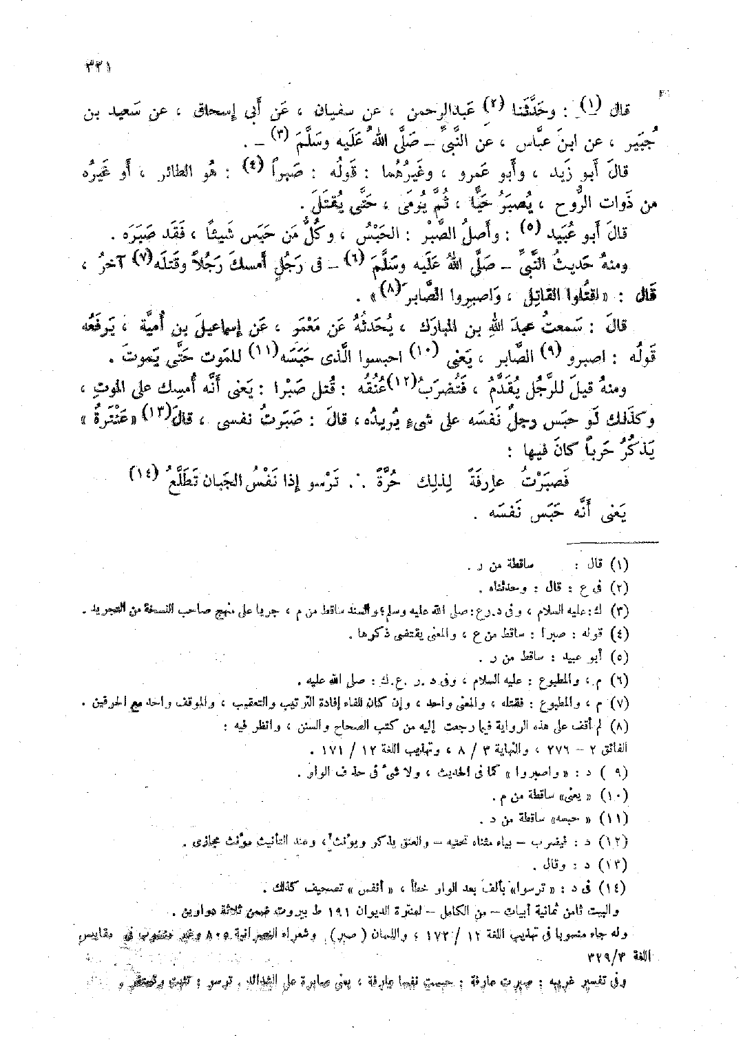 ومنه قيل للرجل يقدم، فتضرب عنقه: قتل صبرًا: يعني أنه أمسك على الموت، وكذلك لو حبس رجل نفسه عن شيء يريده، قال: صبرت نفسي، قال "عنتزة" يذكر حربًا كان فيها: