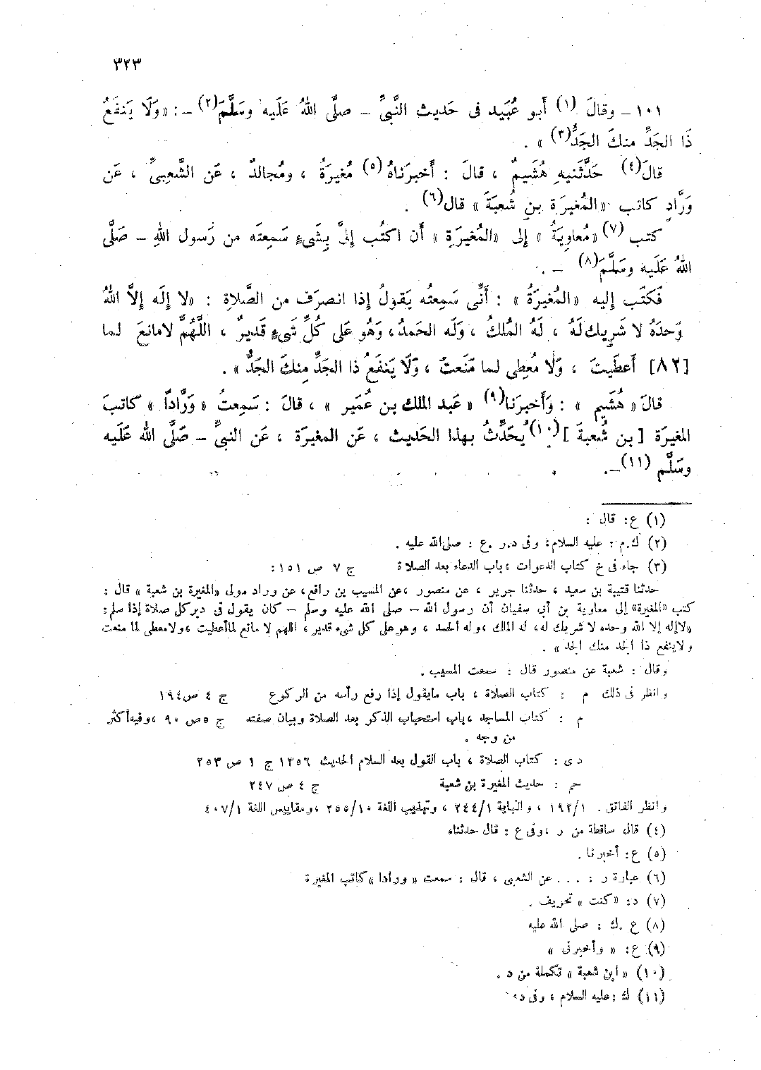 قال "هشيم": وأخبرنا "عبد الملك بن عمير"، قال: سمعت "ورادًا" كاتب المغيرة [بن شعبة]. يحدث بهذا الحديث، عن المغيرة، عن النبي -صلى الله عليه وسلم-.