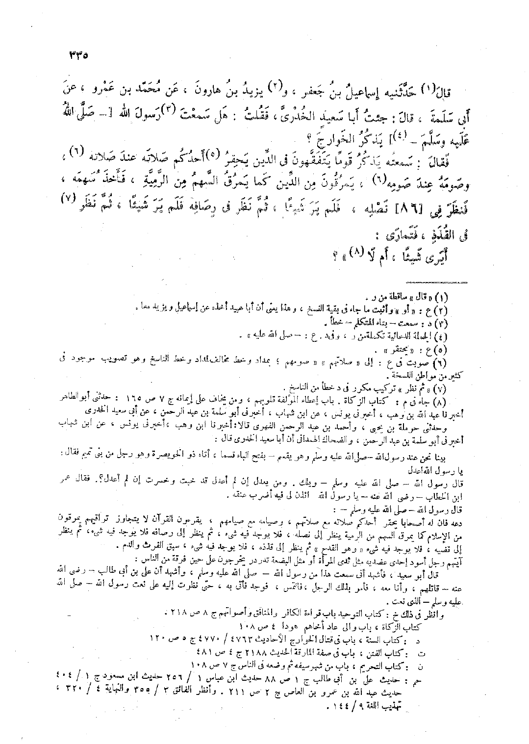 فقال: سمعته يذكر قومًا يتفقهون في الدين يحقر أحدكم صلاته عند صلاته، وصومه عند صومه، يمرقون من الدين كما يمرق السهم من الرّمية، فأخذ سهمه، فنظر في [86] نصله، فلم ير شيئًا، ثم نظر في رصافه فلم ير شيئًا، ثم نظر في القذذ، فتمارى: