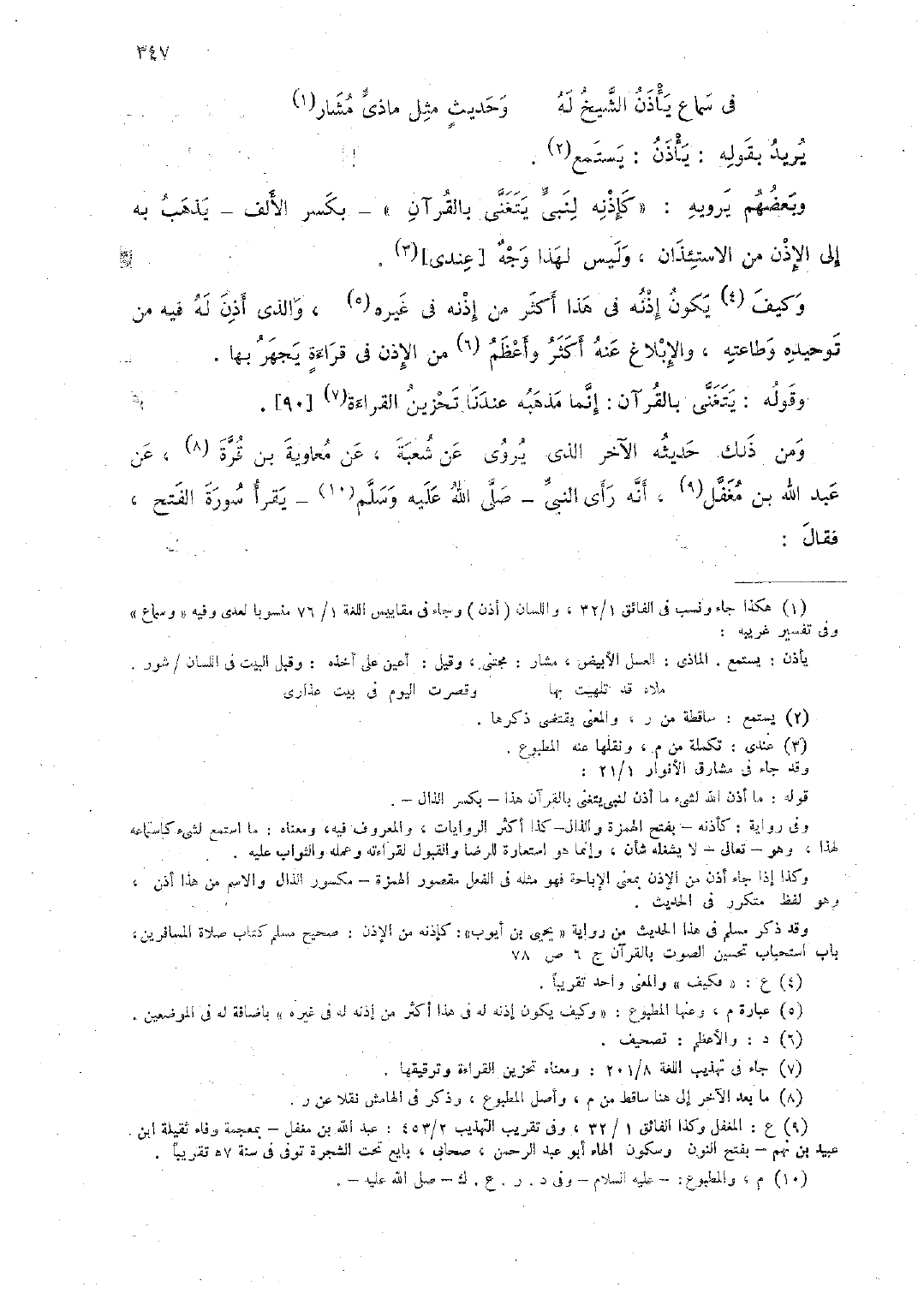 بعضهم يرويه: "كإذبة لنبيّ يتغنى بالقرآن" -بكير الألف- يذهب به إلى الإذن من الاستئذان، وليس لهذا وجه [عندي].