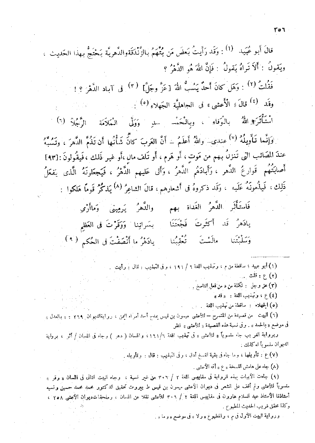 وإنّما تأويله عندي -والله أعلم- أن العرب كان شأنها أن تذم الدهر، وتسبه عند المصائب التي تنزل بهم من موت، أو هرم، أو تلف مال، أو غير ذلك، فيقولون: [93] أصابتهم قوارع الدّهر، وأبادهم الدّهر، وأتى عليهم الدّهر، فيجعلونه الذي يفعل ذلك، فيذمونه عليه، وقد ذكروه في أشعارهم، قال الشاعر يذكر قومًا هلكوا: