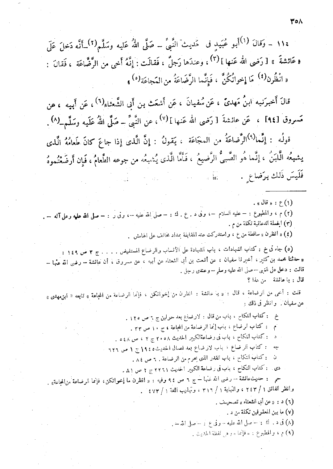 114 - وقال أبو عبيد في حديث النبيّ -صلى الله عليه وسلم- أنه دخل على "عائشة" [رضي الله عنها]، وعندها رجل، فقالت: إنه أخى من الرضاعة، فقال: "انظرن ما إخوانكن، فإنّما الرضاعة من المجاعة"