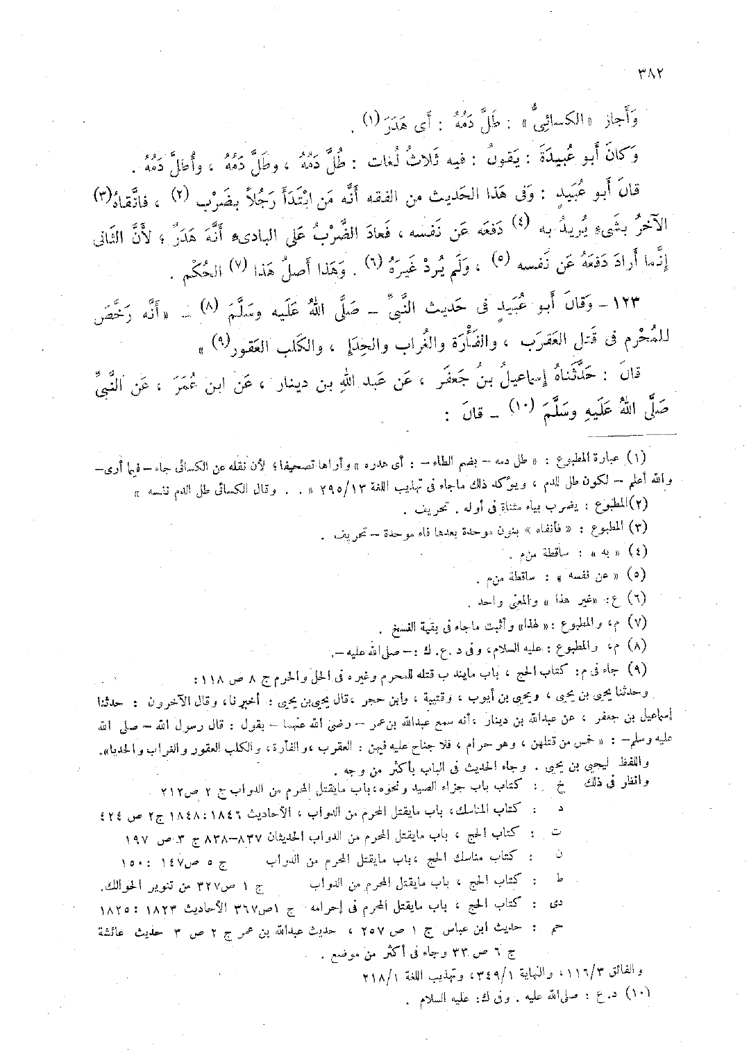 123 - وقال أبو عبيد في حديث النَّبيِّ -صلى الله عليه وسلم- "أنَّه رخِّص للمحرم في قتل العقرب، والفأرة والغراب والحدإ، والكلب العقور".