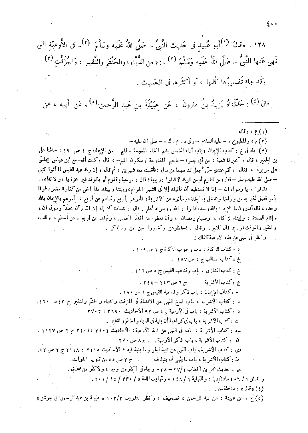 128 - وقال أبو عبيد في حديث النَّبيِّ -صلَّى الله عليه وسلَّم- في الأوعية التي نهى عنها النَّبيِّ -صلى الله عليه وسلم-: "من الدُّباَّء، والحنتم والنَّقير، والمزقت".