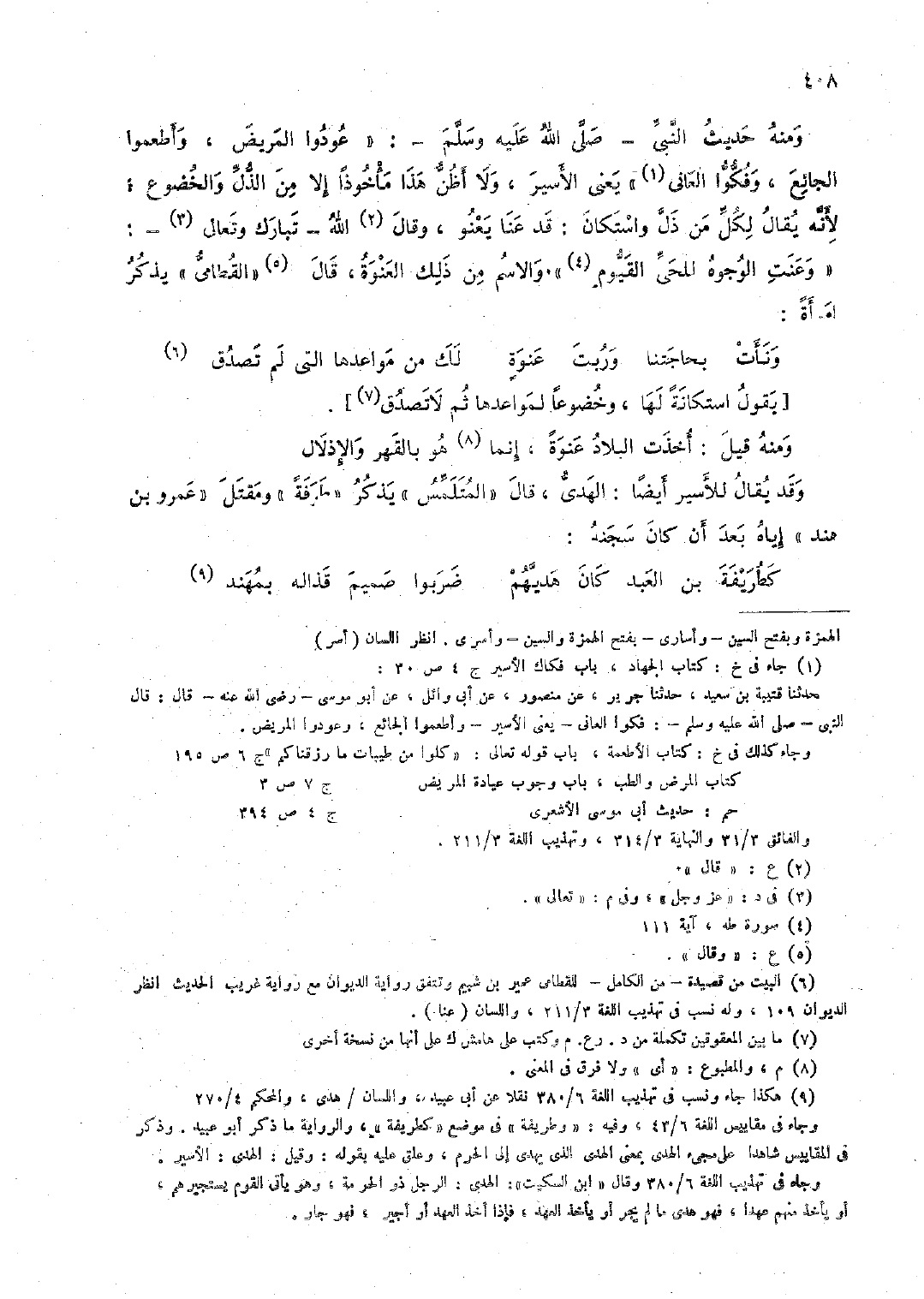 ومنه حديث النَّبيِّ -صلى الله عليه وسلم-: "عودوا المريض، وأطعموا الجائع، وفكُّوُّا العاني" يعني الأسير، ولا أظنُّ هذا مأخوذًا إلا من الذُّلِّ والخضوع؛ لأنَّه يقال لكلِّ من ذلَّ واستكان: قد عنا يعنو، وقال الله - تبارك وتعالى -: "وعنت الوجوه للحي القيُّوم". والاسم من ذلك العنوة، قال "القطاميُّ" يذكر امرأة: