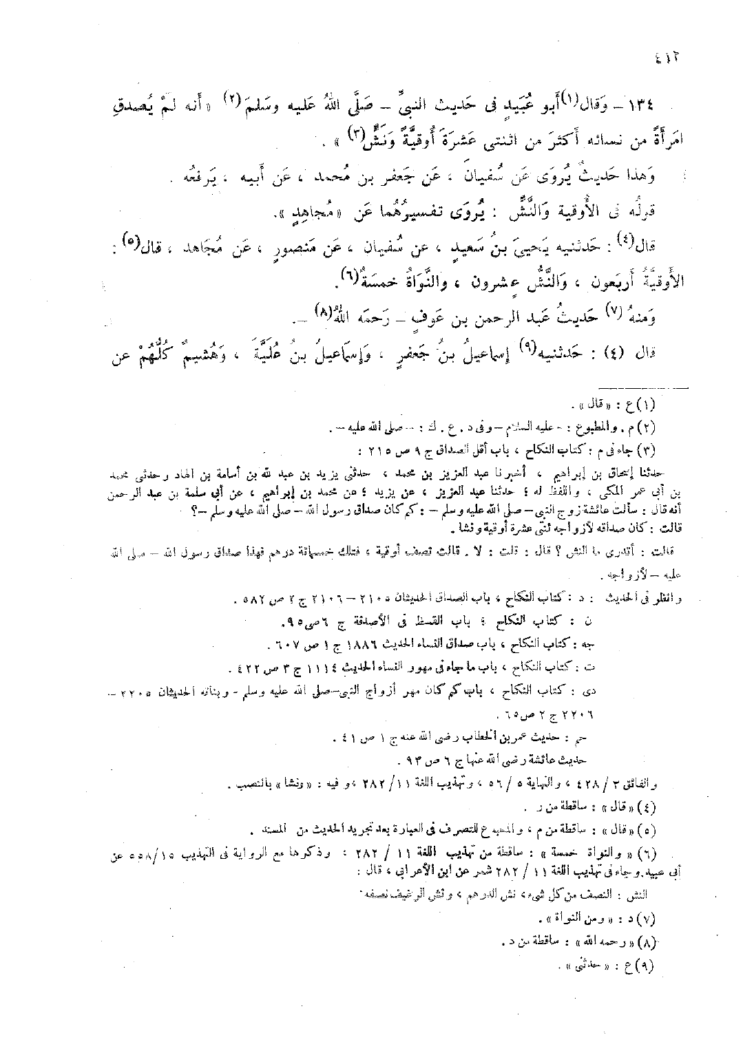 134 - وقال أبو عبيد في حديث النَّبيِّ -صلَّى الله عليه وسلَّم- "أنه لم يصدق امرأة من نسائه أكثر من اثنتي عشرة أوقيَّة ونشِّ".