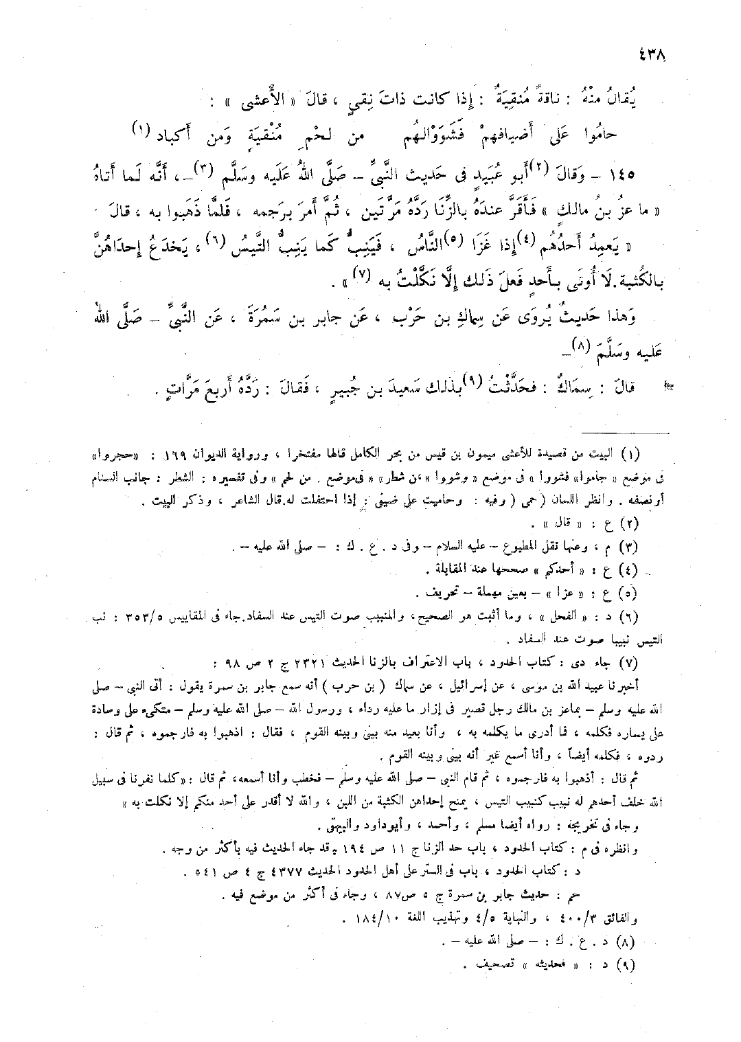 145 - وقال أبو عبيد في حديث النَّبيِّ -صلى الله عليه وسلم-، وأنَّه لما أتاه "ما عز بن مالك" فأقرَّ عنده بالزَّنا ردَّه مرتَّين، ثم أمر برجمه، فلمَّا ذهبوا به، قال "يعمد أحدهم إذا غزا النَّاس، فينب كما ينب التيس، يخدع إحداهنَّ بالكثبة. لا أوتي بأحد فعل ذلك إلاَّ نكلَّت به".