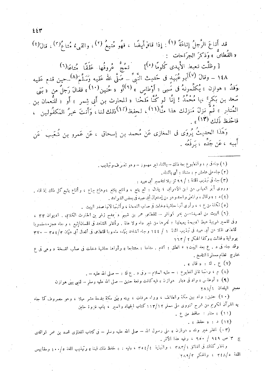 148 - وقال أبو عبيد في حديث النَّبيِّ -صلَّى الله عليه وسلَّم- حين قدم عليه وفد "هوازن" يكلِّمونه في سبى "أوطاس" أو "حنين" فقال رجل من "بني سعد بن بكر"، يا محمد! إنَّا لو كنَّا ملحنا "للحارث بن أبي شمر" أو "للنُّعمان بن المنذر" ثمَّ نزل منزلك هذا منَّا، لحفظ ذلك لنا، وأنت خير المكفولين، فاحفظ ذلك".