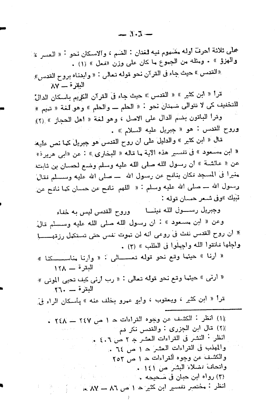 قرأ «ابن كثير» «القدس» حيث جاء في القرآن الكريم باسكان الدال للتخفيف كي لا تتوالى ضمتان نحو: «الحلم- والحلم» وهو لغة «تميم» وقرأ الباقون بضم الدال على الاصل، وهو لغة «اهل الحجاز» (¬3) وروح القدس: هو «جبريل عليه السلام».