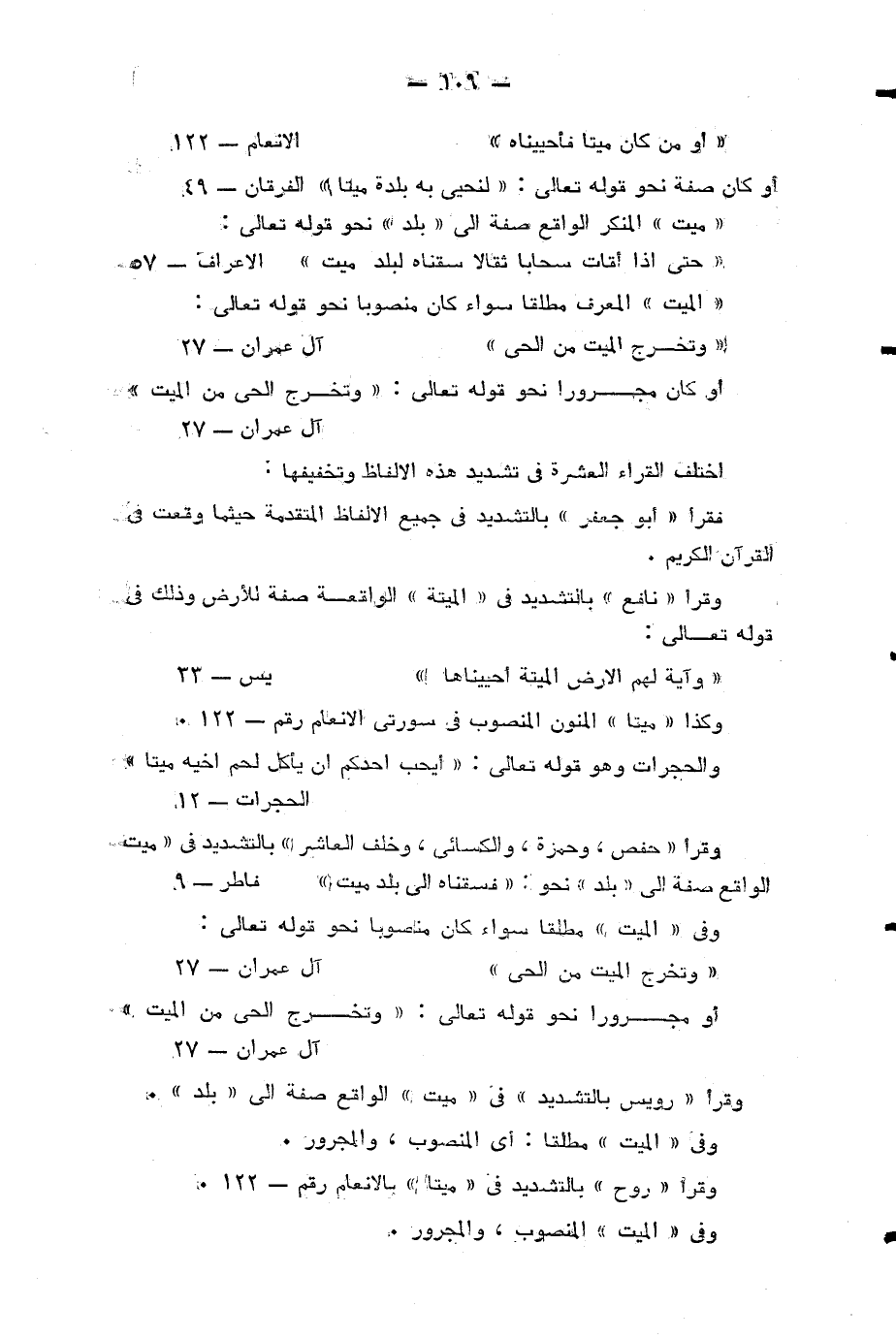 .. وَتُخْرِجُ الْمَيِّتَ مِنَ الْحَيِّ (¬8) او مجرورا نحو قوله تعالى: وَتُخْرِجُ الْحَيَّ مِنَ الْمَيِّتِ (¬9) وقرأ «رويس بالتشديد» في «ميت» الواقع صفة الى «بلد».