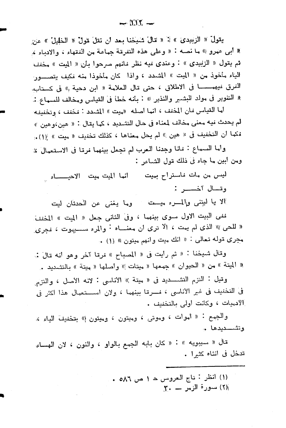 ما نصه: «وعلى هذه التفرقة جماعة من الفقهاء، والادباء، ثم يقول «الزبيدي»: وعندي فيه نظر فانهم صرحوا بان «الميت» مخفف الياء مأخوذ من «الميت» المشدد، واذا كان مأخوذا منه فكيف يتصور الفرق فيهما في الاطلاق، حتى قال العلامة «ابن دحية» في كتاب «التنوير في مولد البشير والنذير»: بأنه خطأ في القياس ومخالف للسماع: