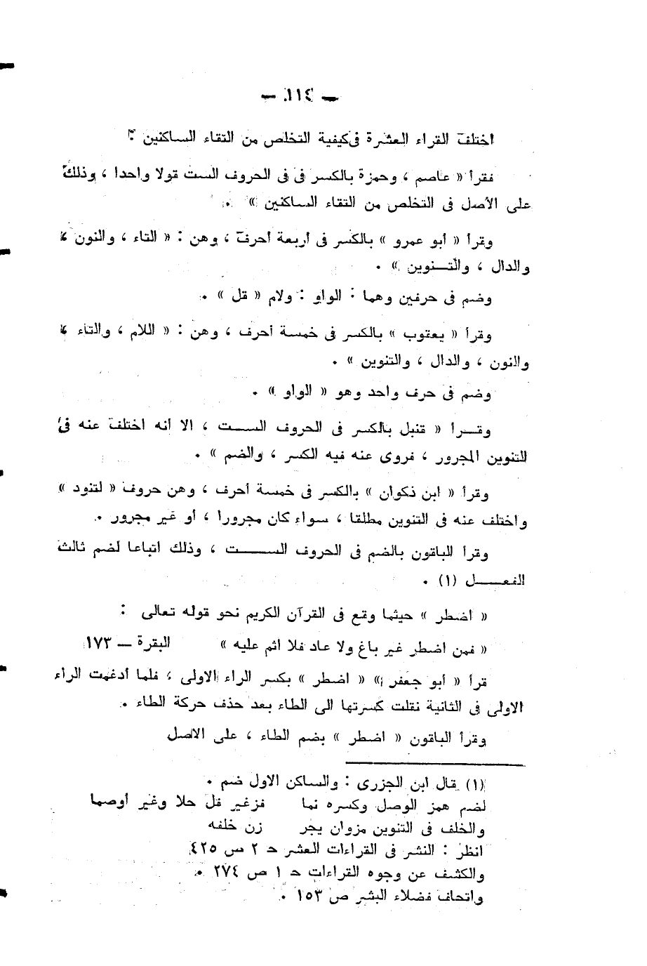 .. فَمَنِ اضْطُرَّ غَيْرَ باغٍ وَلا عادٍ فَلا إِثْمَ عَلَيْهِ (¬2) قرأ «ابو جعفر» «اضطر» بكسر الراء الاولى، فلما ادغمت الراء الاولى في الثانية نقلت كسرتها الى الطاء بعد حذف حركة الطاء.