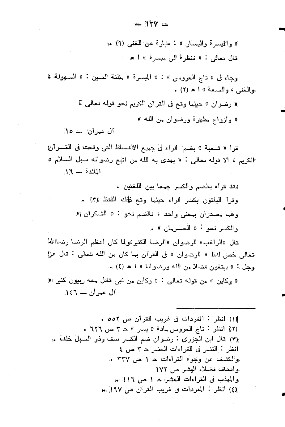 وَأَزْواجٌ مُطَهَّرَةٌ وَرِضْوانٌ مِنَ اللَّهِ (¬3) قرأ «شعبة» بضم الراء في جميع الالفاظ التي وقعت في القرآن الكريم، الا قوله تعالى: يَهْدِي بِهِ اللَّهُ مَنِ اتَّبَعَ رِضْوانَهُ سُبُلَ السَّلامِ (¬4) فقد قرأه بالضم والكسر جمعا بين اللغتين.