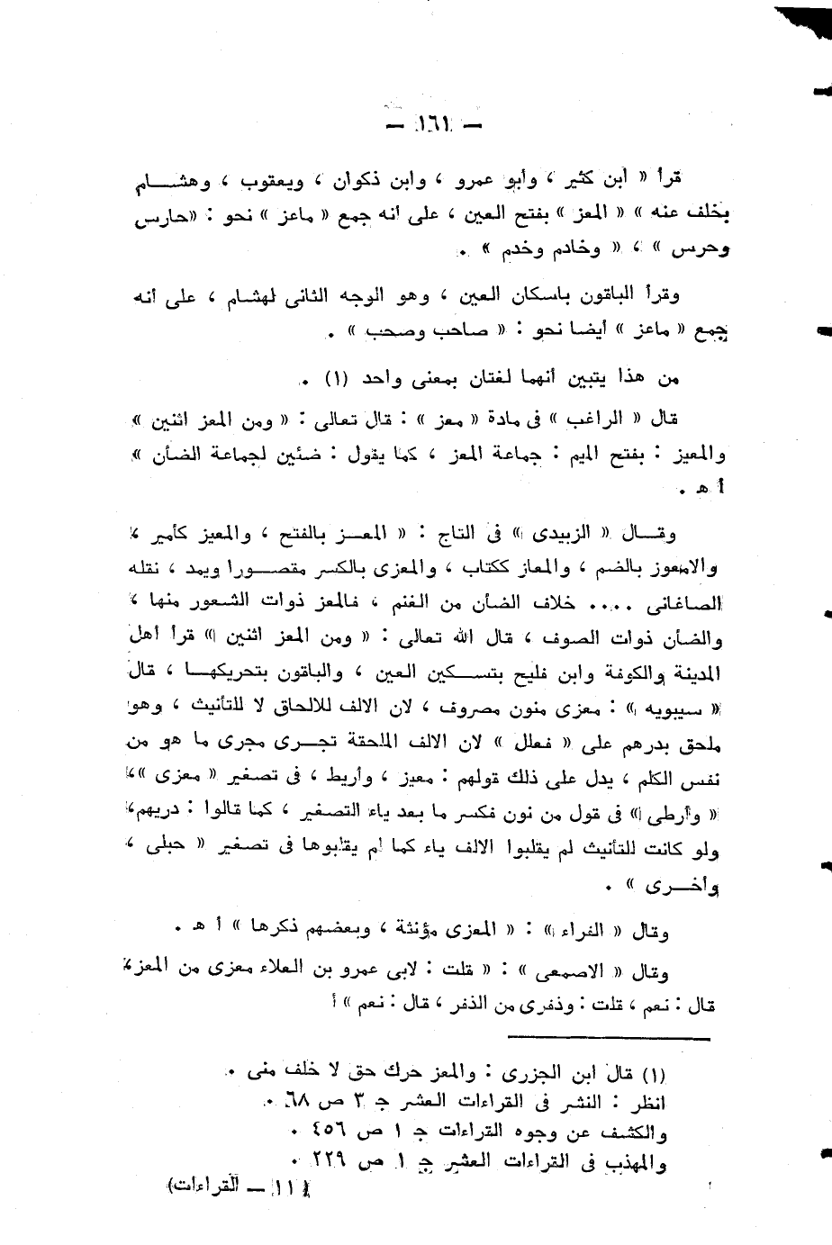 قرأ «ابن كثير، وابو عمرو، وابن ذكوان، ويعقوب، وهشام بخلف عنه» «المعز» بفتح العين، على انه جمع «ماعز» نحو: «حارس وحرس»، «وخادم وخدم».