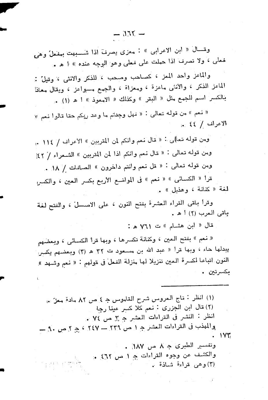 قرأ «الكسائي» «نعم» في المواضع الاربعة بكسر العين، والكسر لغة «كنانة، وهذيل».