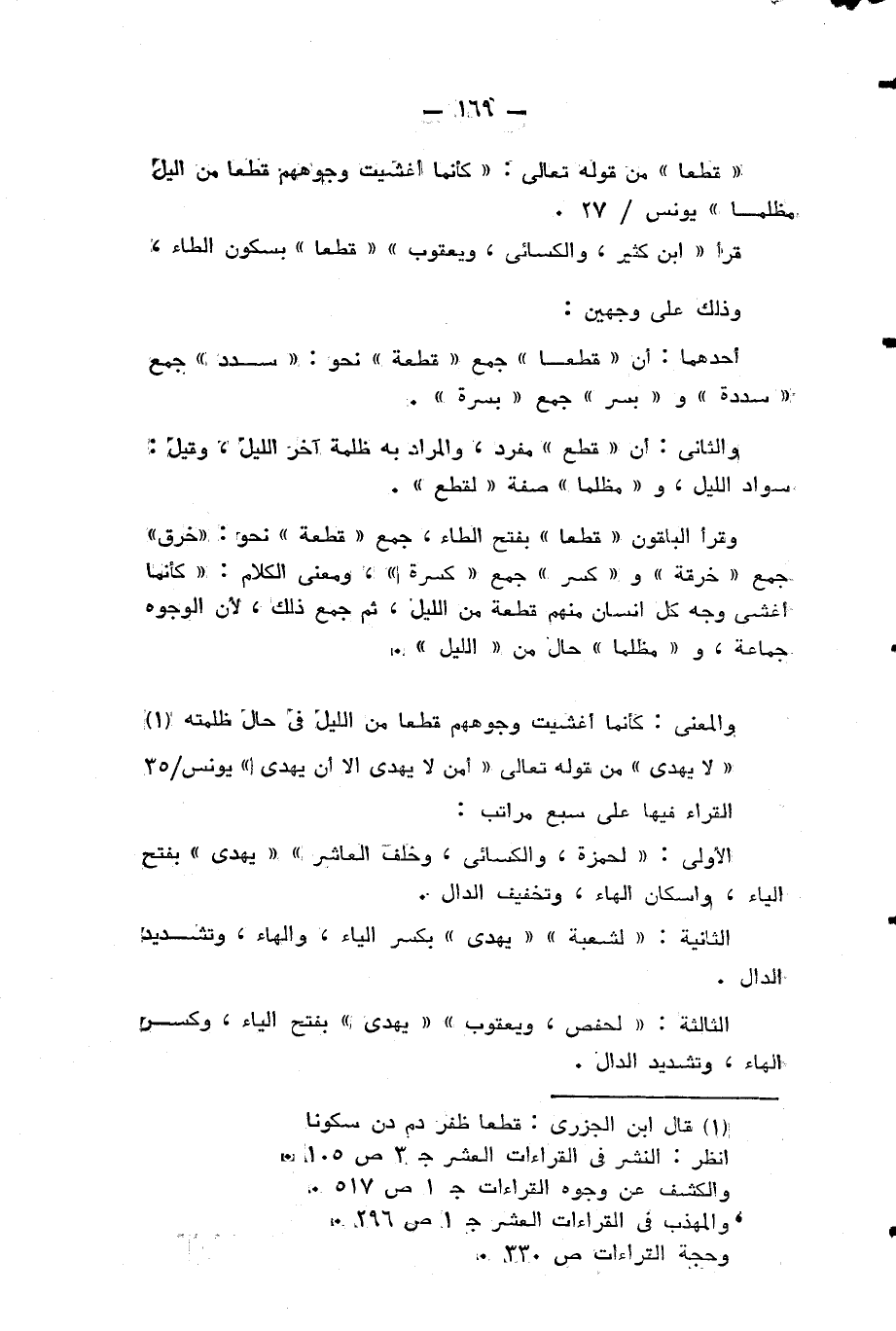 وقرأ الباقون «قطعا» بفتح الطاء، جمع «قطعة» نحو: خرق» جمع «خرقة» و «كسر» جمع «كسرة»، ومعنى الكلام: «كأنما اغشى وجه كل انسان منهم قطعة من الليل، ثم جمع ذلك، لان الوجوه جماعة، و «مظلما» حال من «الليل».