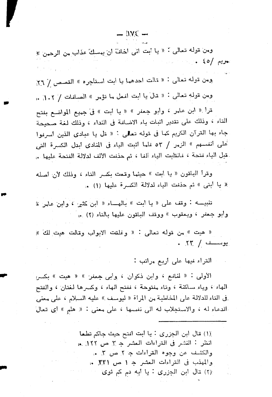 قرأ «ابن عامر، وابو جعفر» «يا أبت» في جميع المواضع بفتح التاء، وذلك على تقدير اثبات ياء الاضافة في النداء، وذلك لغة صحيحة جاء بها القرآن الكريم كما في قوله تعالى: قُلْ يا عِبادِيَ الَّذِينَ أَسْرَفُوا عَلى أَنْفُسِهِمْ (¬4) فلما اثبت الياء في المنادى ابدل الكسرة التي قبل الياء فتحة، فانقلبت الياء الفا، ثم حذفت الالف لدلالة الفتحة عليها.