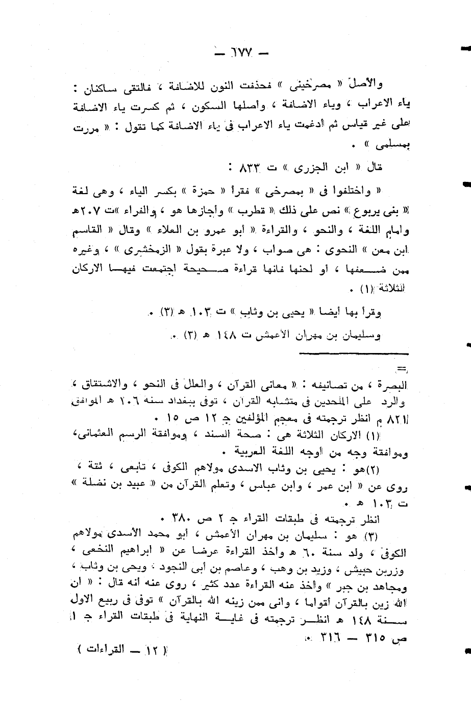 يربوع» نص على ذلك «قطرب» واجازها هو، «والفراء» ت 207 هـ وامام اللغة، والنحو، والقراءة «ابو عمرو بن العلاء» وقال «القاسم بن معن» النحوي: هي صواب، ولا عبرة بقول «الزمخشري»، وغيره ممن ضعفها، او لحنها فانها قراءة صحيحة اجتمعت فيها الاركان الثلاثة (¬1).