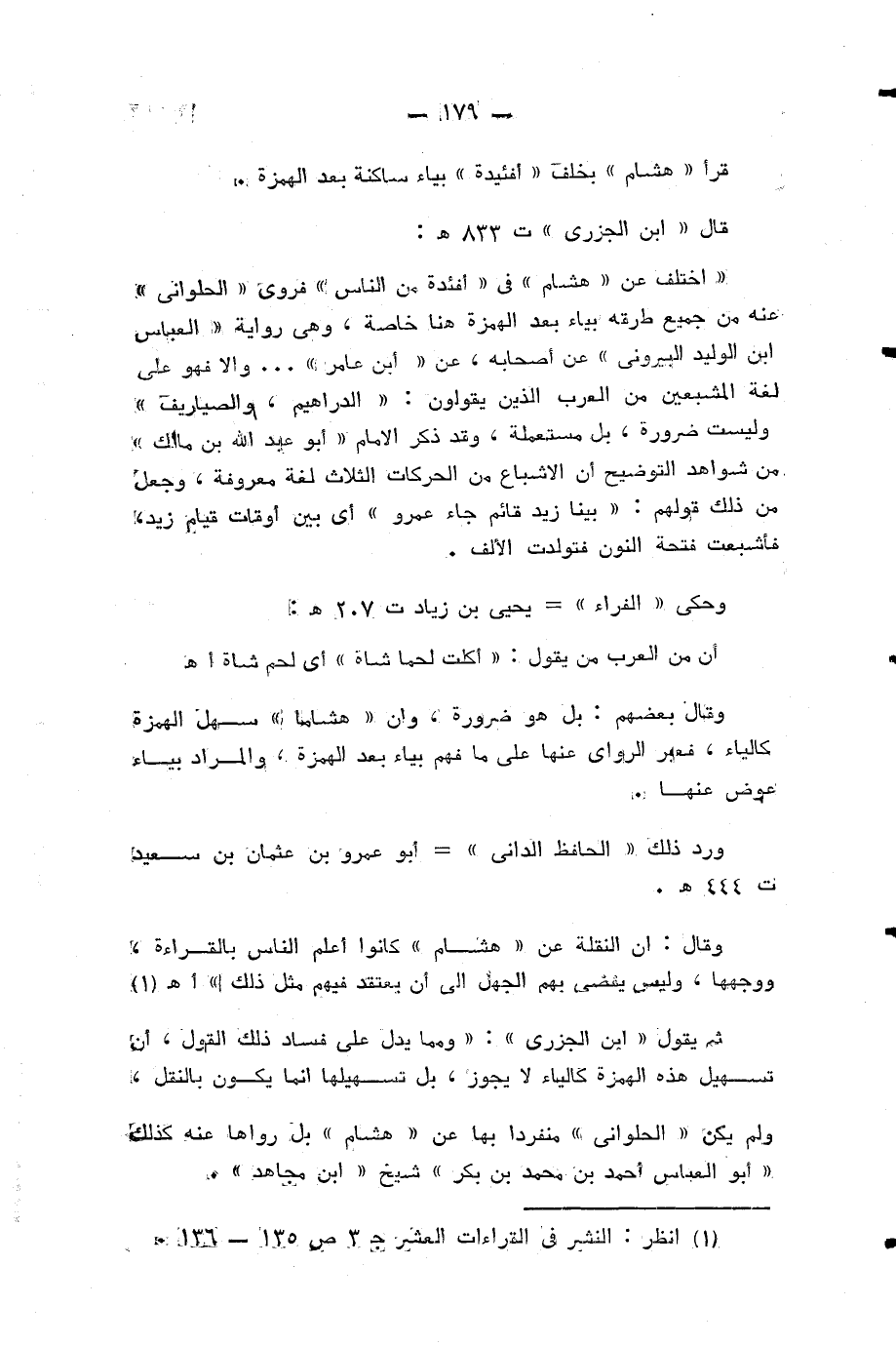 ثم يقول «ابن الجزري»: «ومما يدل على فساد ذلك القول، ان تسهيل هذه الهمزة كالياء لا يجوز، بل تسهيلها انما يكون بالنقل، ولم يكن «الحلواني» منفردا بها عن «هشام» بل رواها عنه كذلك «ابو العباس احمد بن محمد بن بكر» شيخ «ابن مجاهد».