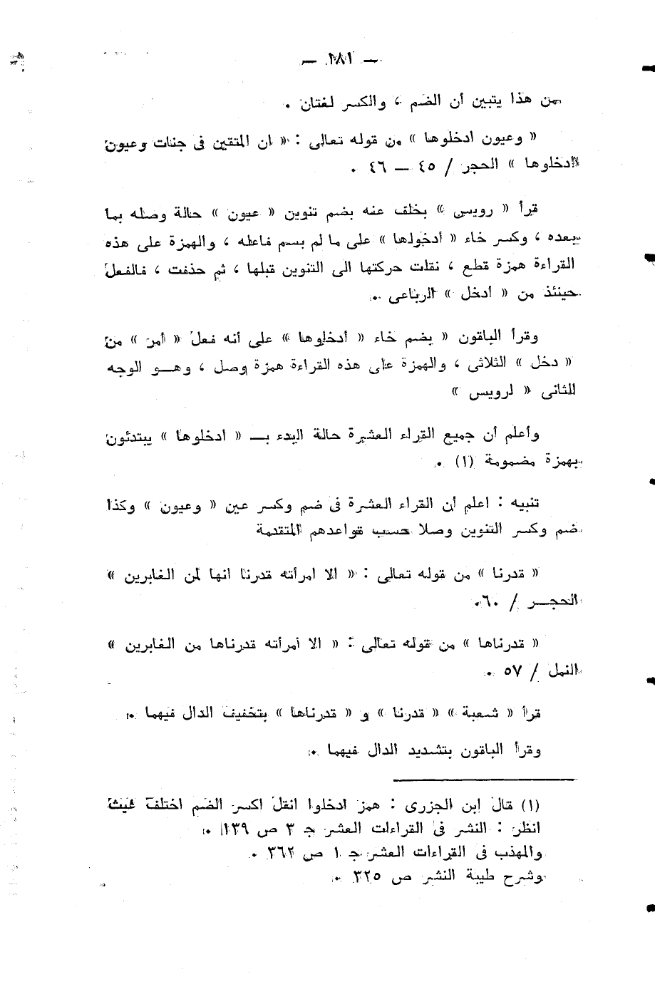 واعلم ان جميع القراء العشرة حالة البدء ب «ادخلوها» يبتدئون بهمزة مضمومة (¬2).