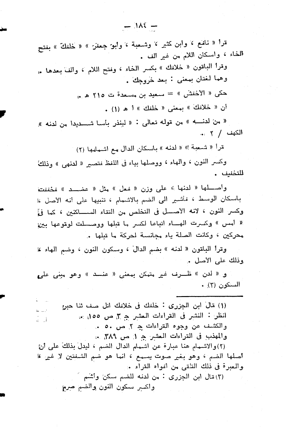 واصلها «لدنها» على وزن «فعل» مثل «عضد» فخففت باسكان الوسط، فأشير الى الضم بالاشمام، تنبيها على انه الاصل، وكسر النون، لانه الاصل خلص من التقاء الساكنين، كما في «امس» وكسرت الهاء اتباعا لكسر ما قبلها ووصلت لوقوعها بين محركين، وكانت الصلة ياء مجانسة لحركة ما قبلها.